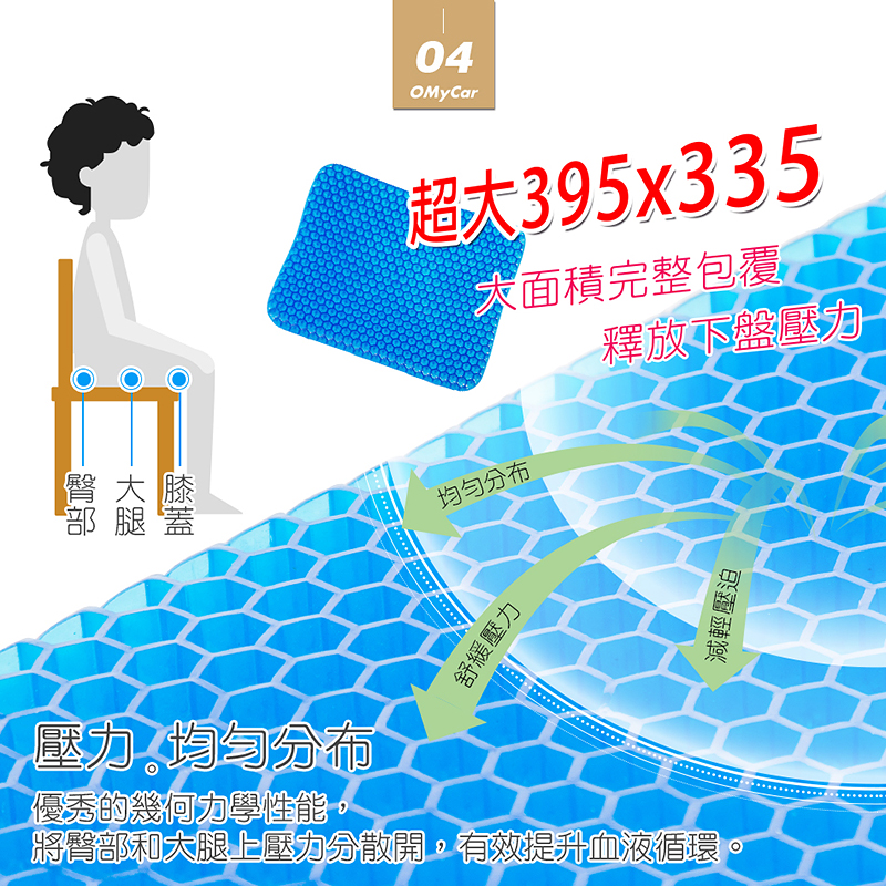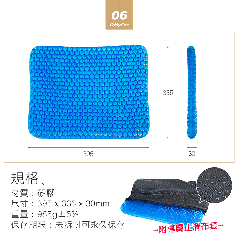 商品規格品名:最新版 3D涼爽 雙層蜂巢凝膠坐墊材質:矽膠尺寸:395x335x30mm重量:985±5%保存期限:未拆封可永久保存產地:中國 (台灣監造)