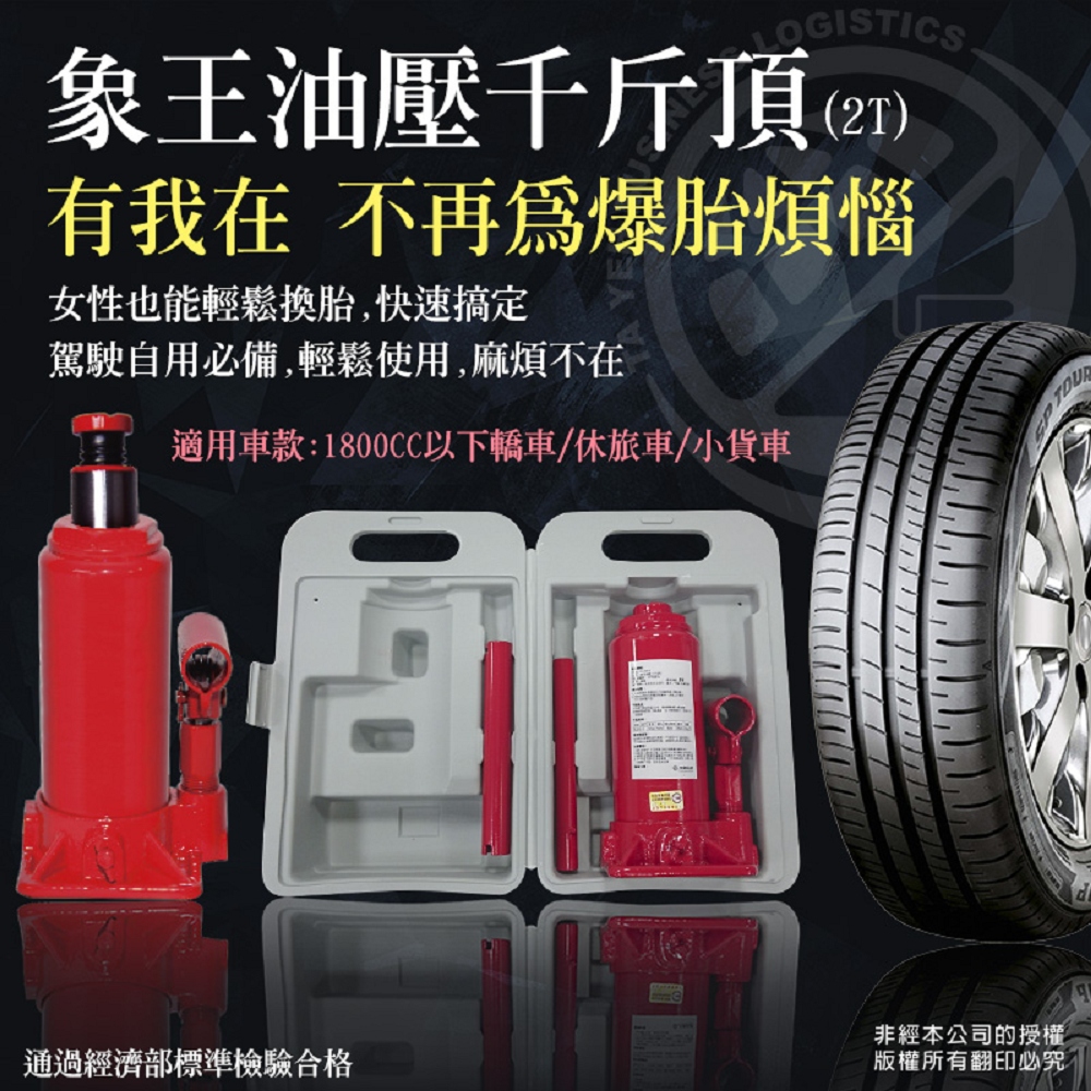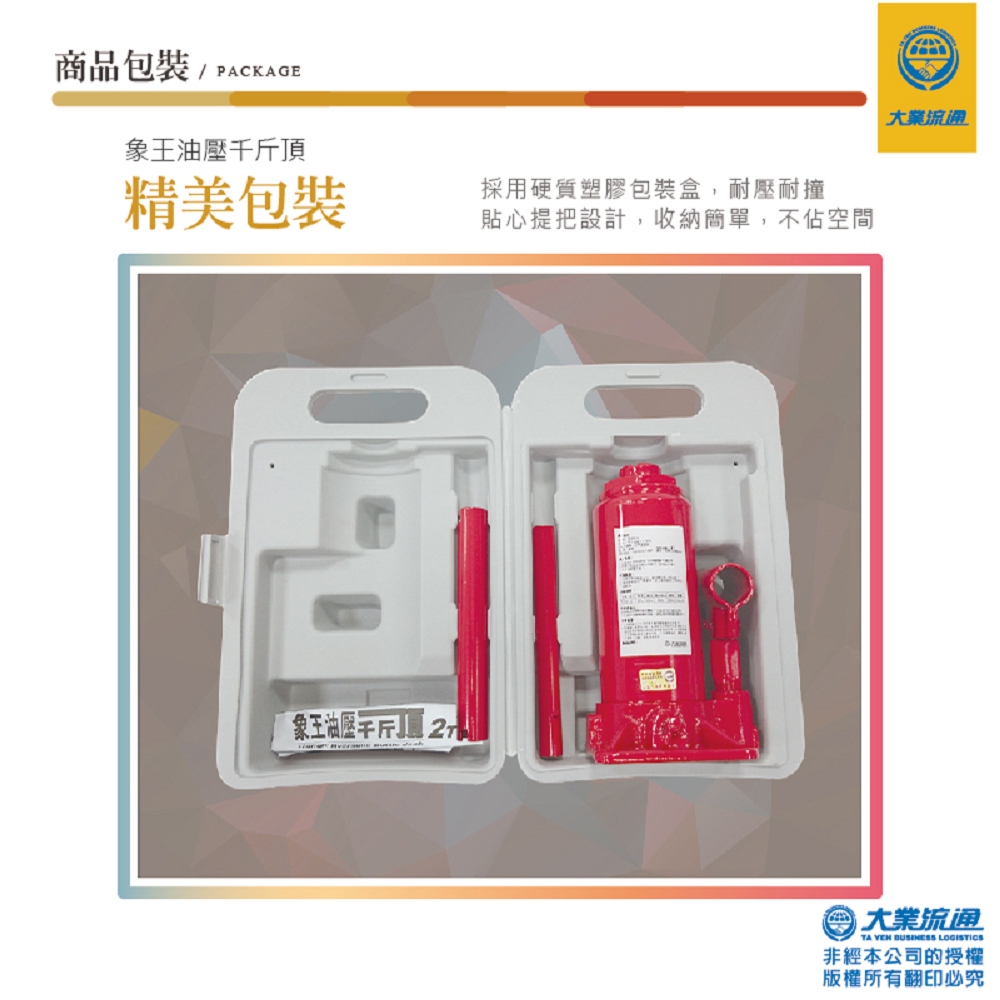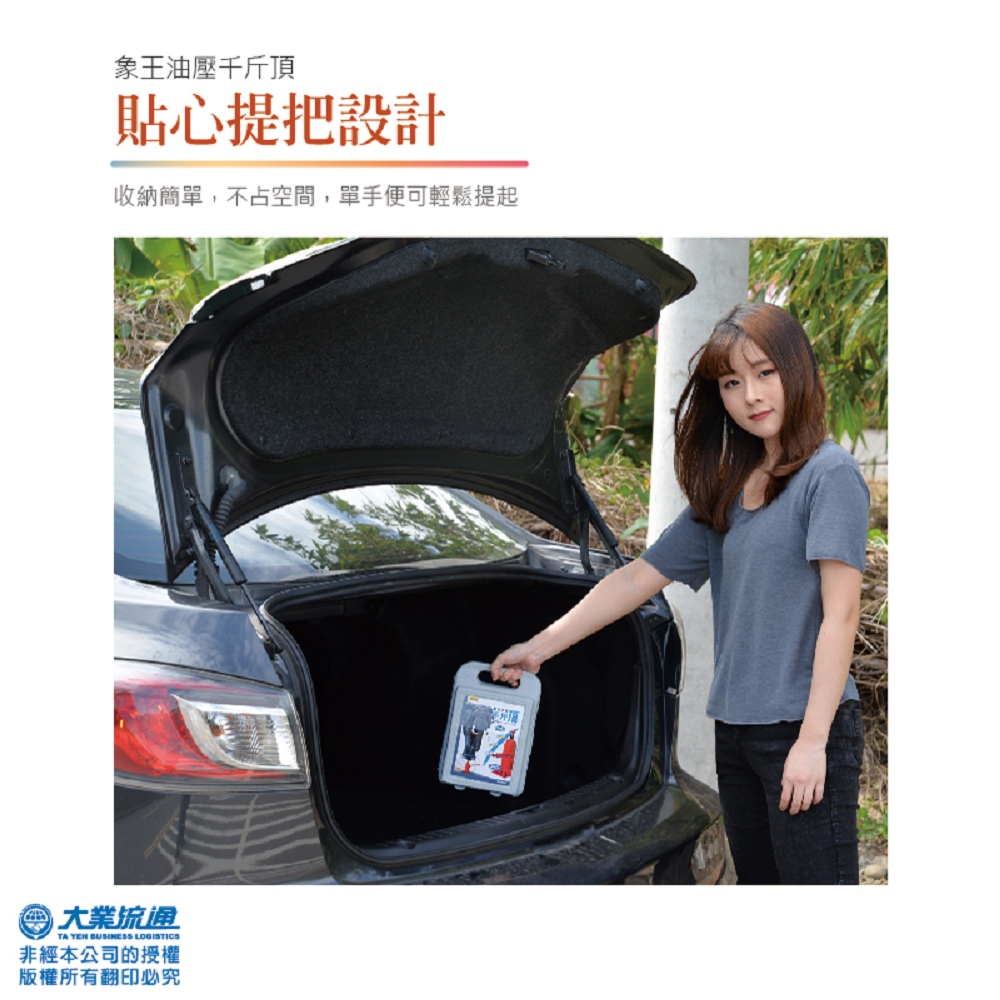 汽車拋錨時別擔心!有象王油壓千斤頂是您的好幫手,組合簡單!未使用過的開車新手族也可一次上手,放至車內體積小不佔空間,並附精美專屬收納盒,幫您省去收納的煩腦!