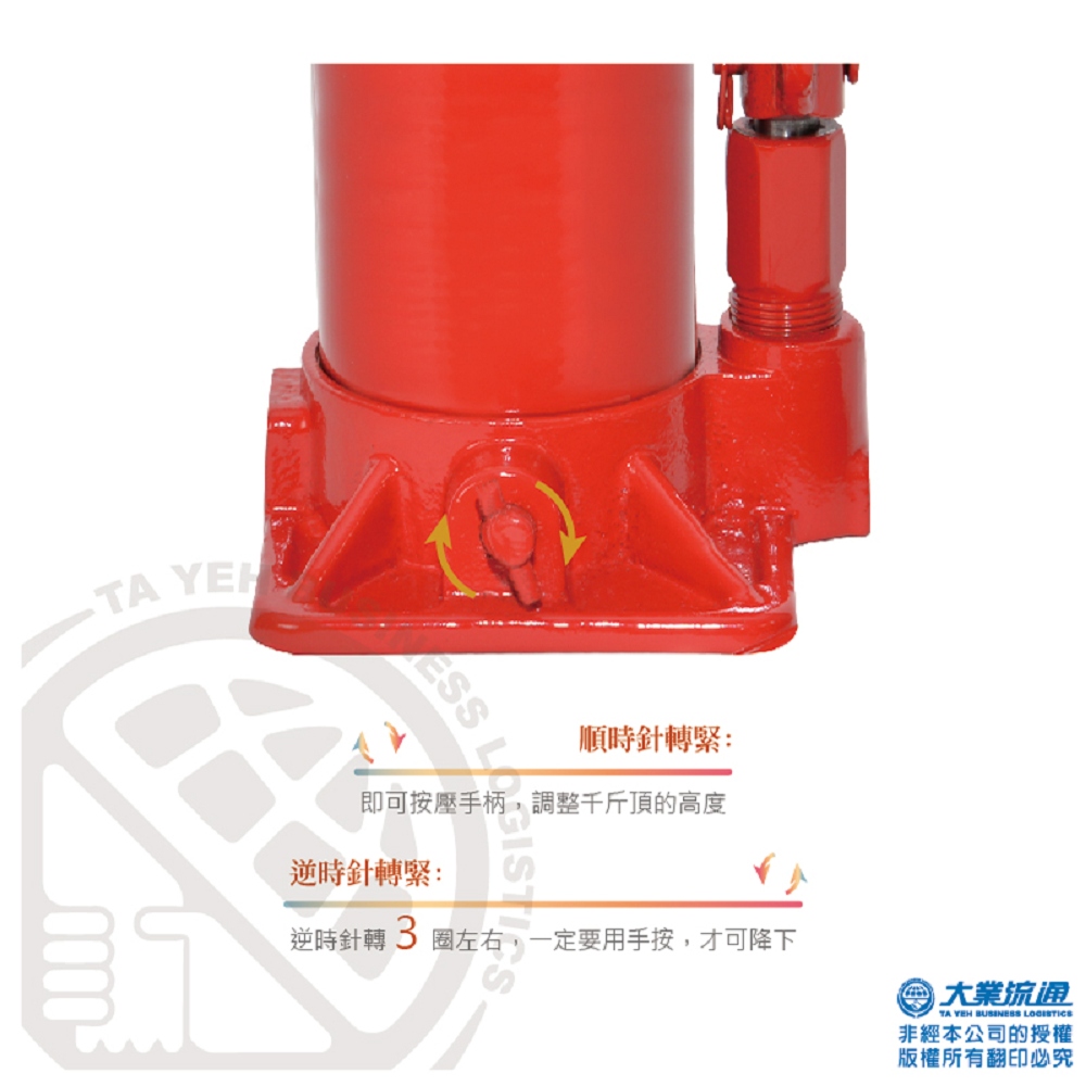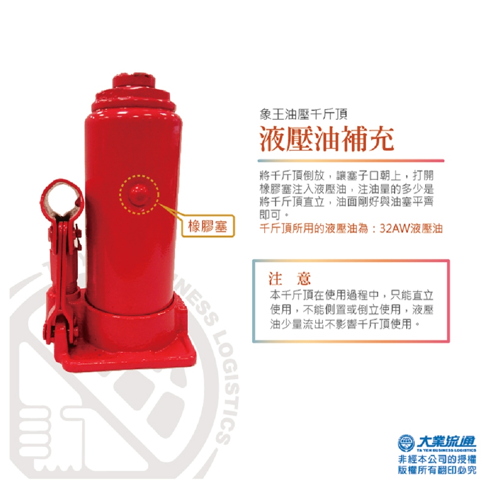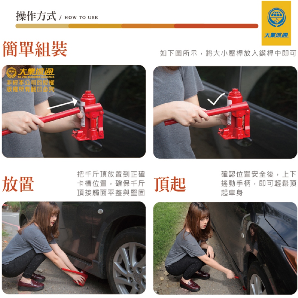 使用方式非常簡單,只要將象王油壓千斤頂,操作桿組合完成,再將象王油壓千斤頂移至定位即可使用,要很有力才有辦法頂起你的愛車嗎?放心!此款千斤頂採油壓式設計女生也可以輕易使用。