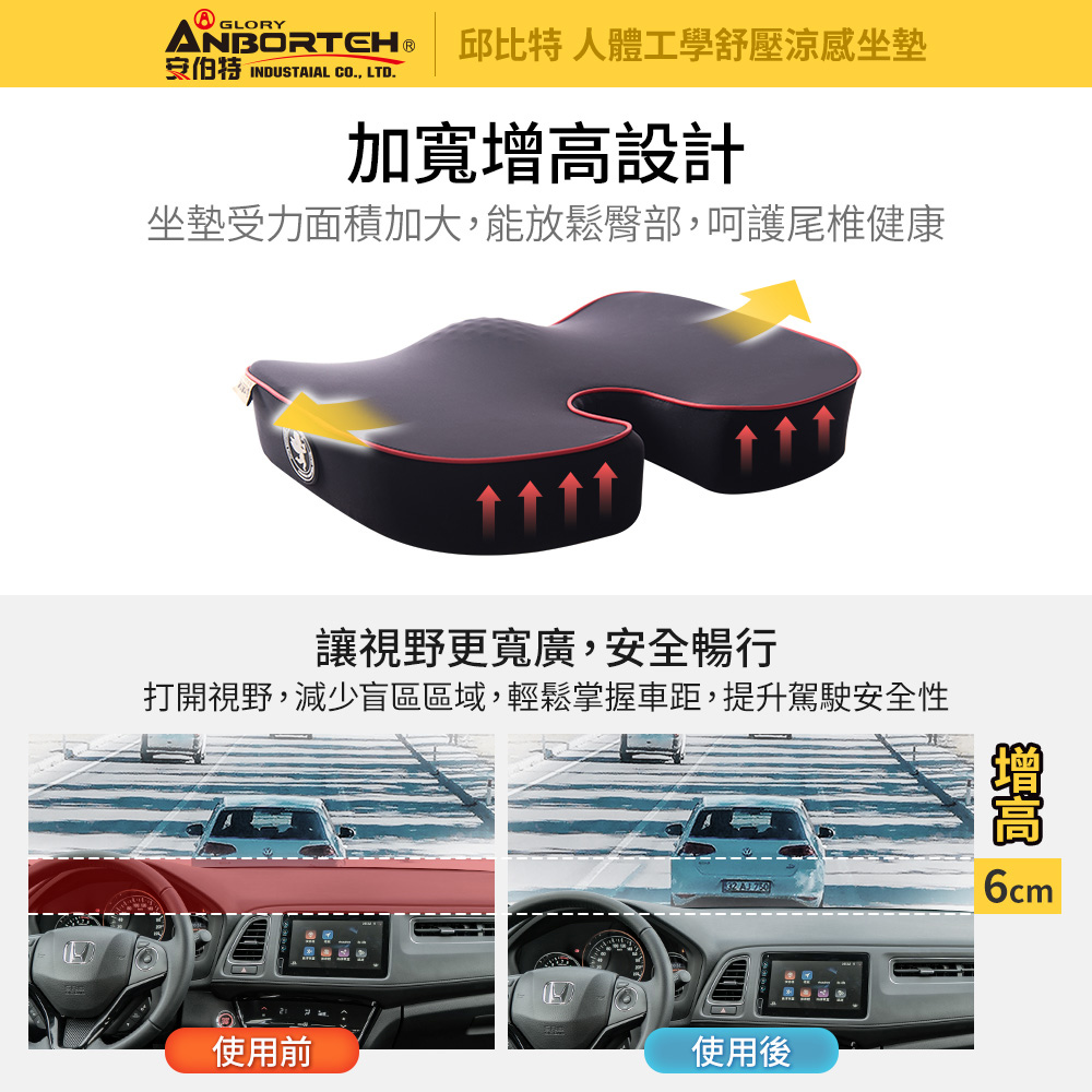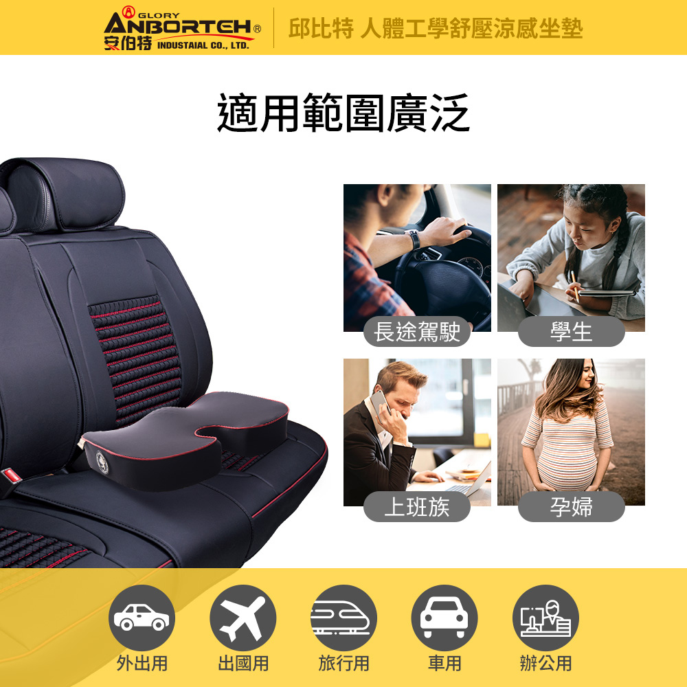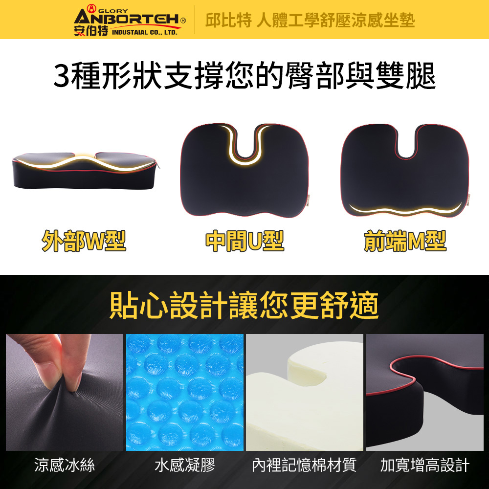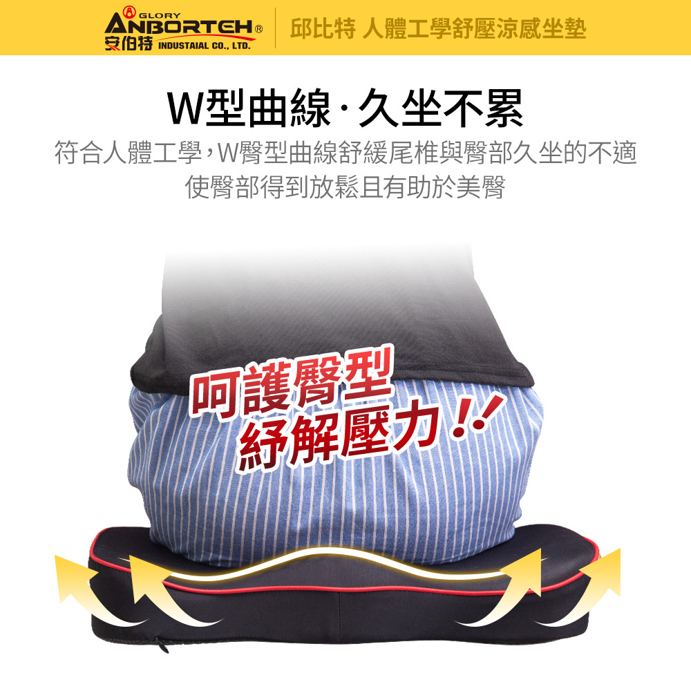 W型曲線 : 舒緩尾椎與臀部久坐的不適U型設計 : 完美支撐,自然放鬆保護尾椎M型設計 : 雙腿可自然放鬆,不易壓迫發麻記憶棉 : 根據溫度和運動調節形狀,貼服臀部水感凝膠 : 舒適涼爽,有效降低體感溫度 加寬增高 : 坐墊受力面積加大,不論性別年齡都適用適用範圍 : 車用、出國、旅行、辦公室均適用