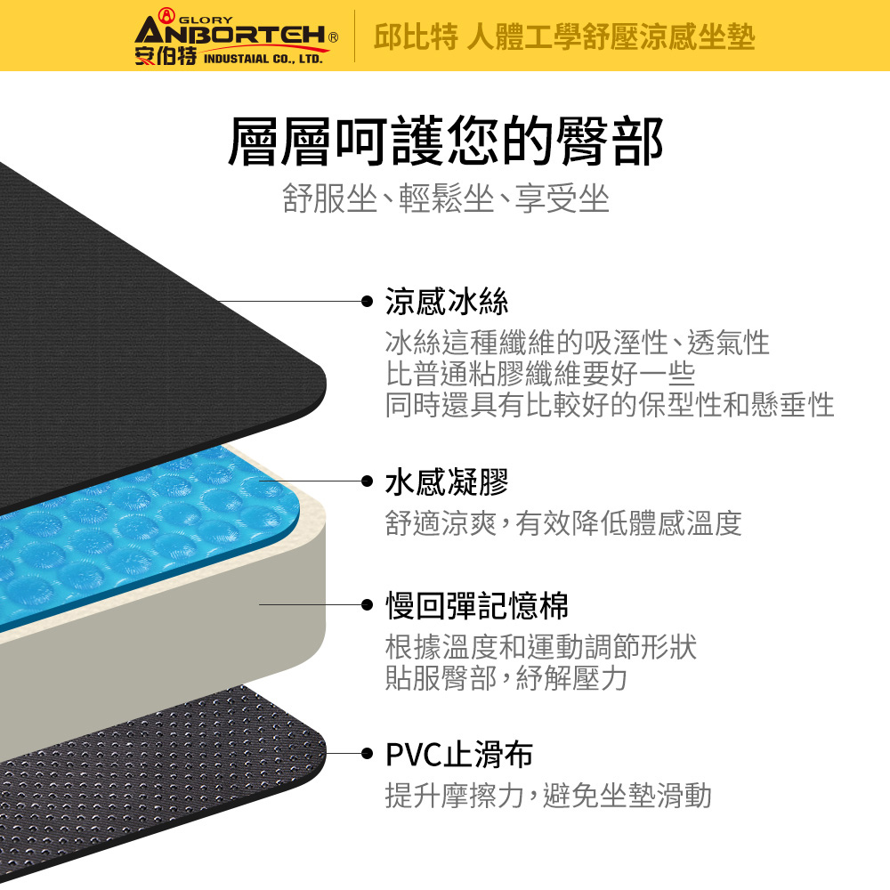 商品規格品名:【安伯特】邱比特舒壓涼感坐墊 料號:ABT-A118材質:冰絲布+PVC止滑布、凝膠記憶枕尺寸:470x370x60mm ±5%重量:690g ±5%保固範圍:新品暇疵產地:中國(台灣監造)
