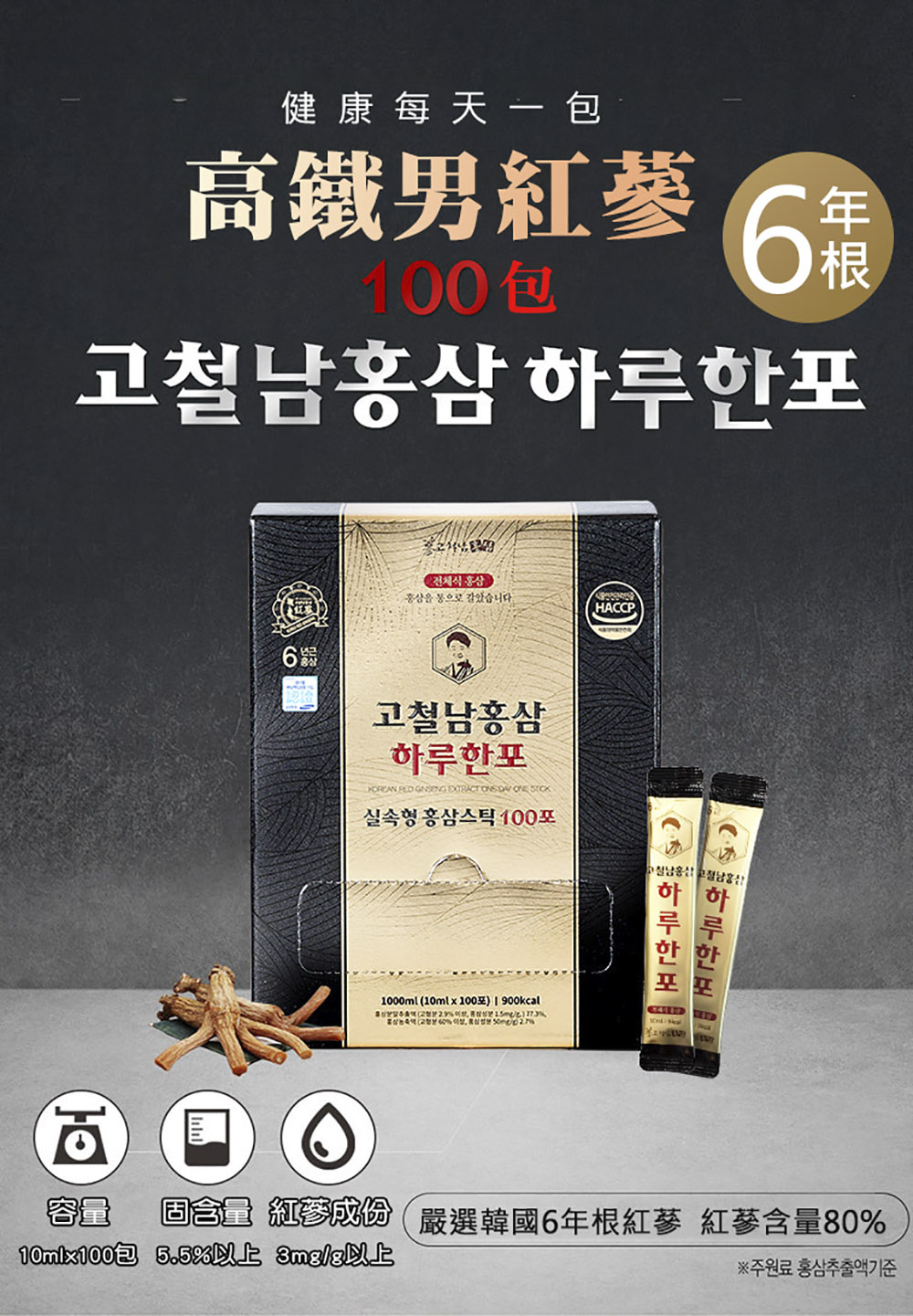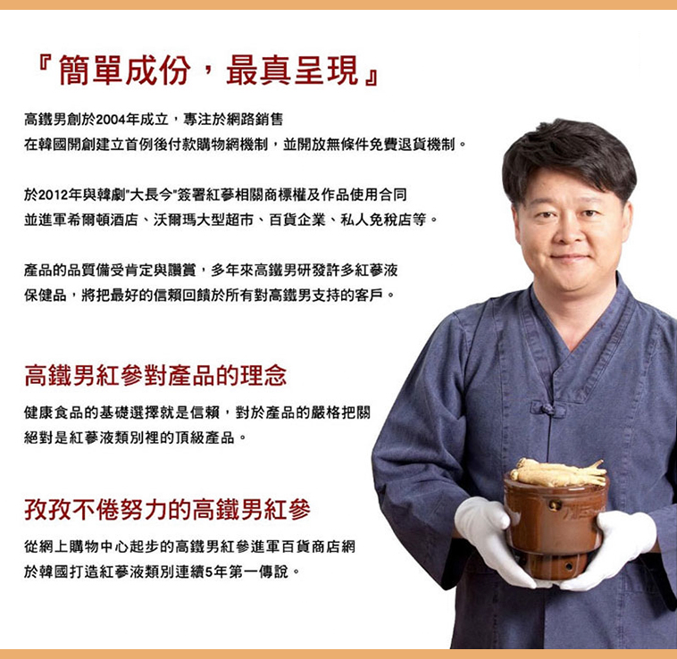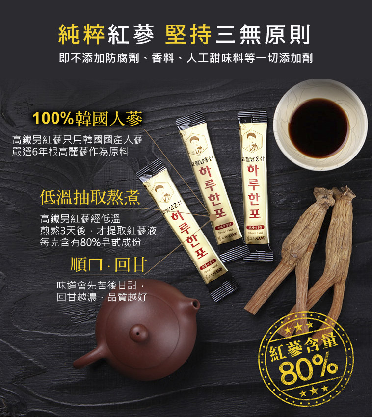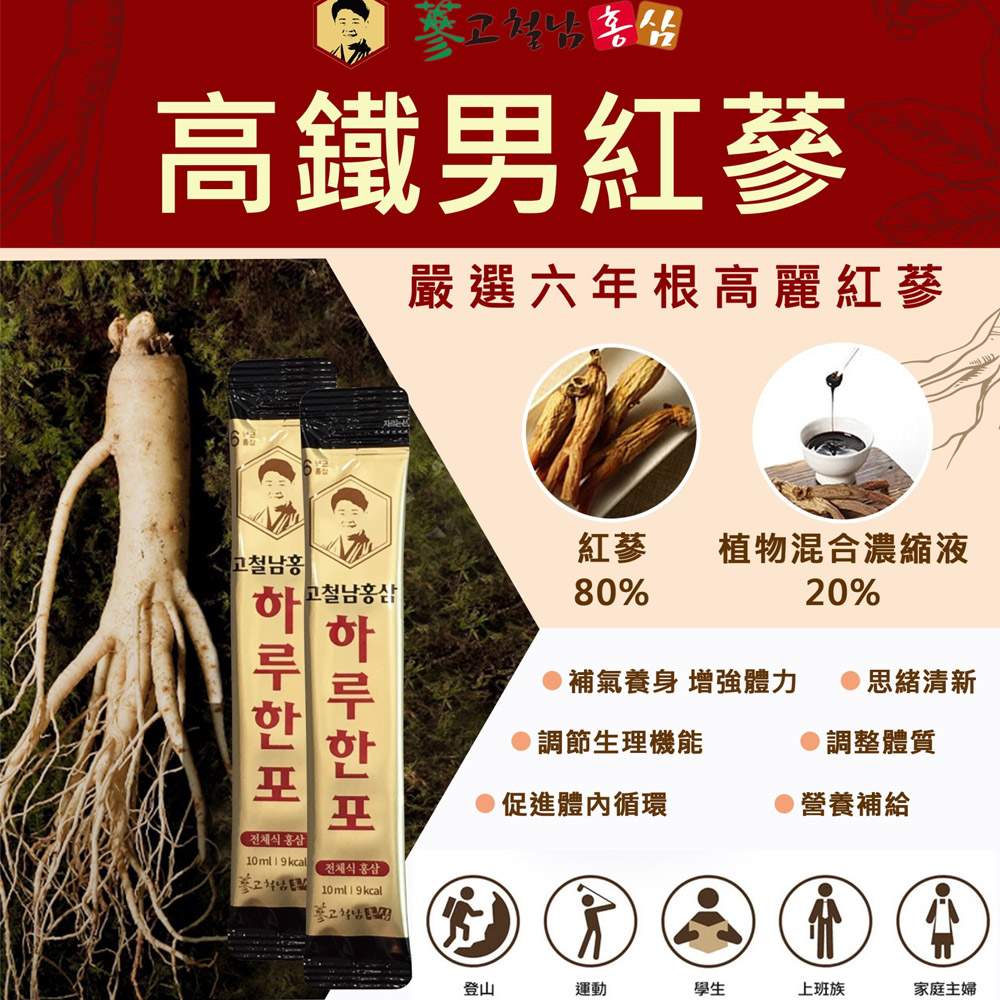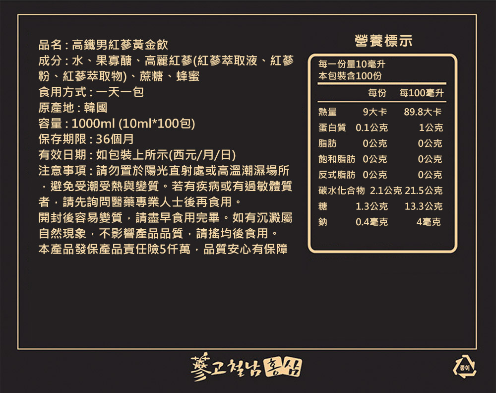 商品名稱:高鐵男紅蔘黃金飲成分:水、果寡醣、高麗紅蔘(紅蔘萃取液、紅蔘粉、紅蔘萃取物)、蔗糖、蜂蜜食用方式:一天一包(素食可用)原產地:韓國容量:1000ml (10ml*100包) x 2盒保存期限:36個月請勿至於陽光直射處或高溫處本產品投保產品責任險5千萬