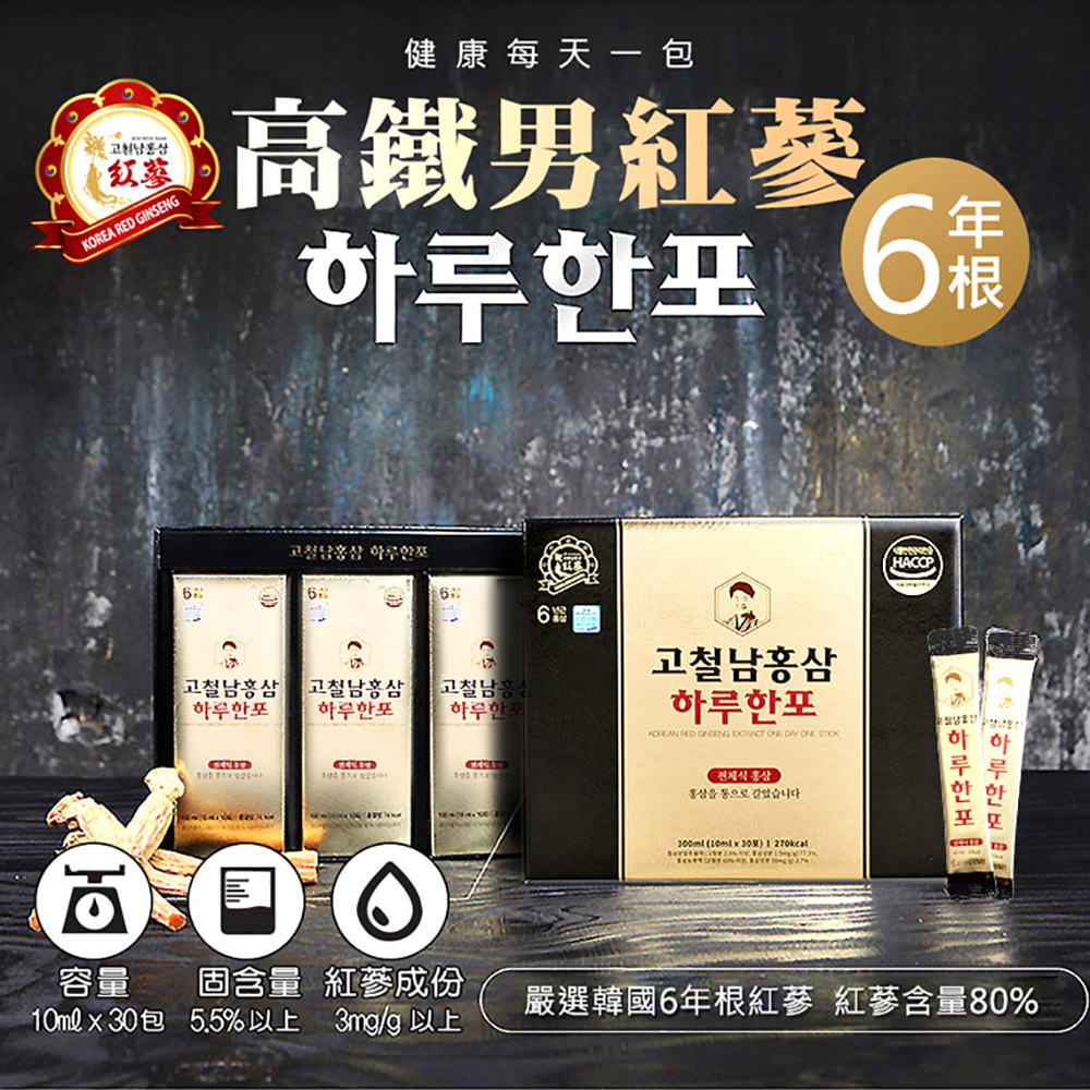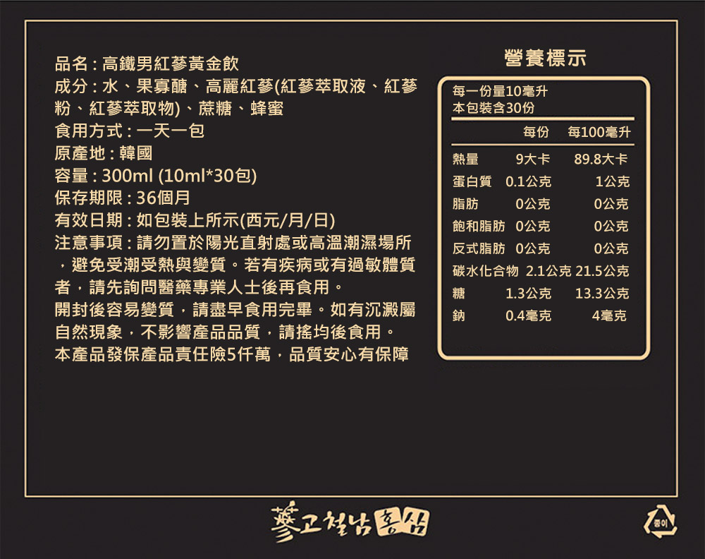 商品名稱:高鐵男紅蔘黃金飲成分:水、果寡醣、高麗紅蔘(紅蔘萃取液、紅蔘粉、紅蔘萃取物)、蔗糖、蜂蜜食用方式:一天一包(素食可用)原產地:韓國容量:300ml (10ml*30包) x 2盒保存期限:36個月請勿至於陽光直射處或高溫處本產品投保產品責任險5千萬
