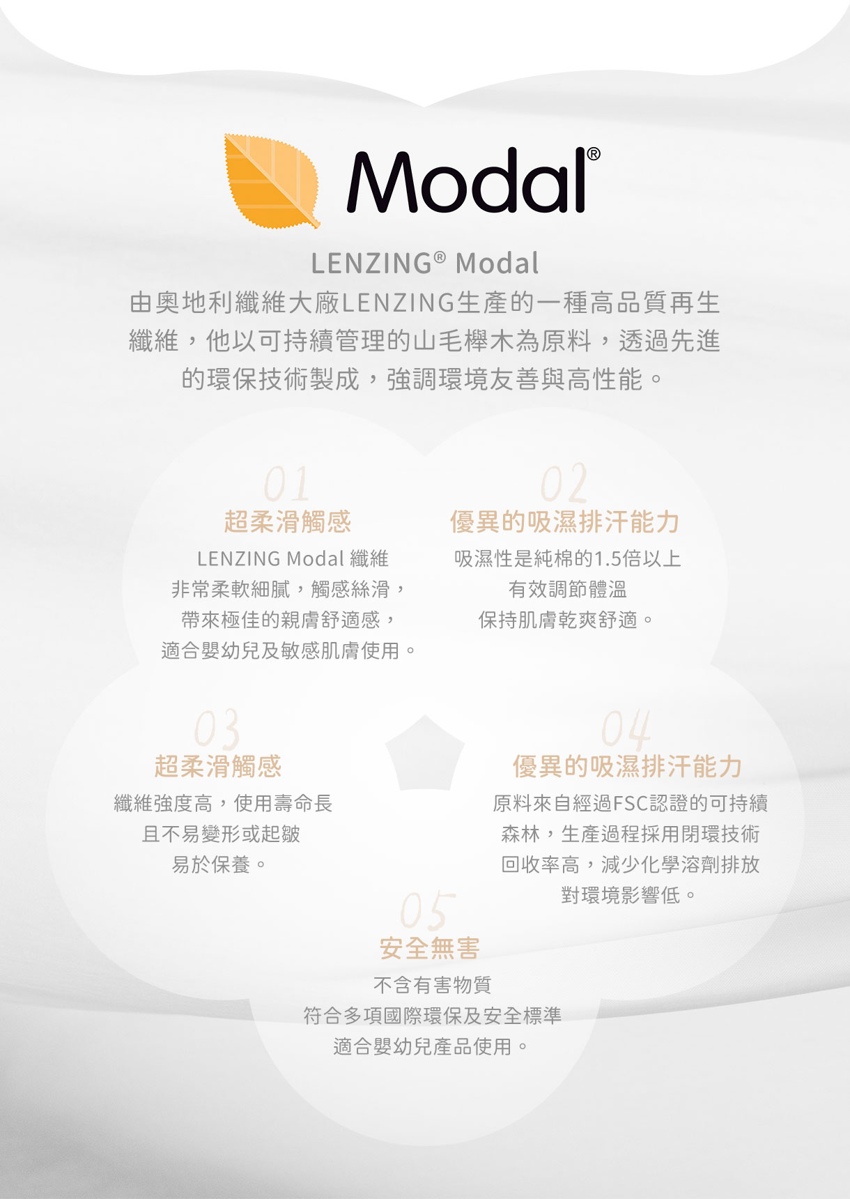 選用高品質天絲莫代爾纖維,觸感細膩柔軟,貼近每一寸肌膚。這種天然纖維具有極佳的透氣性與吸濕性,讓寶寶肌膚享受最溫柔的呵護。
