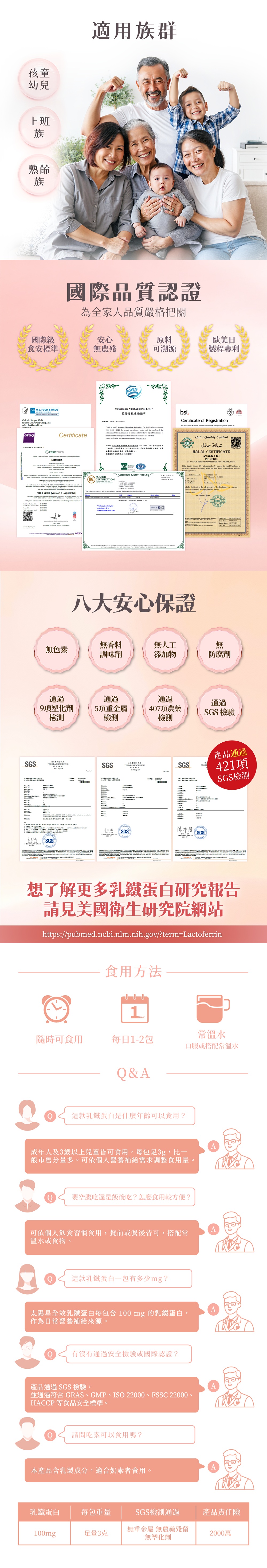 ☆95%高濃度高含量乳鐵蛋白 x 38% IgG含量豐富☆含明星益菌BB536比菲德氏菌,幫助維持消化道機能☆有助於運動後營養補充、增強體力☆24小時法國可溯源黃金初乳☆純淨無添加,不含人工香料、色素、調味劑☆榮獲美國最高GRAS食安規範,通過台灣SGS 421項無農殘檢測