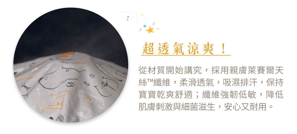 採用親和肌膚的萊賽爾天絲棉™纖維,擁有絲滑柔順的觸感,體感更涼、透氣性佳,能有效吸濕排汗、調節體溫,讓寶寶在炎熱悶濕的天氣也能保持乾爽舒適。