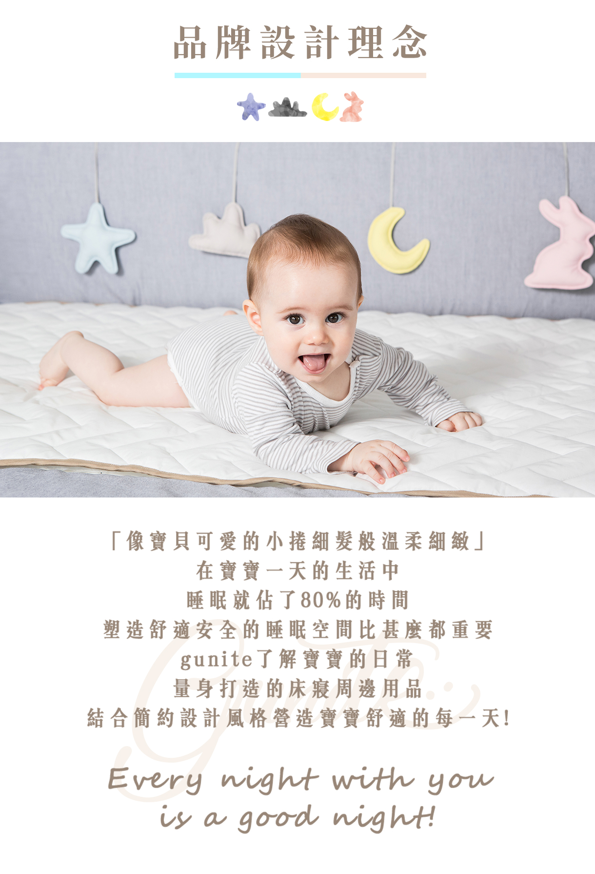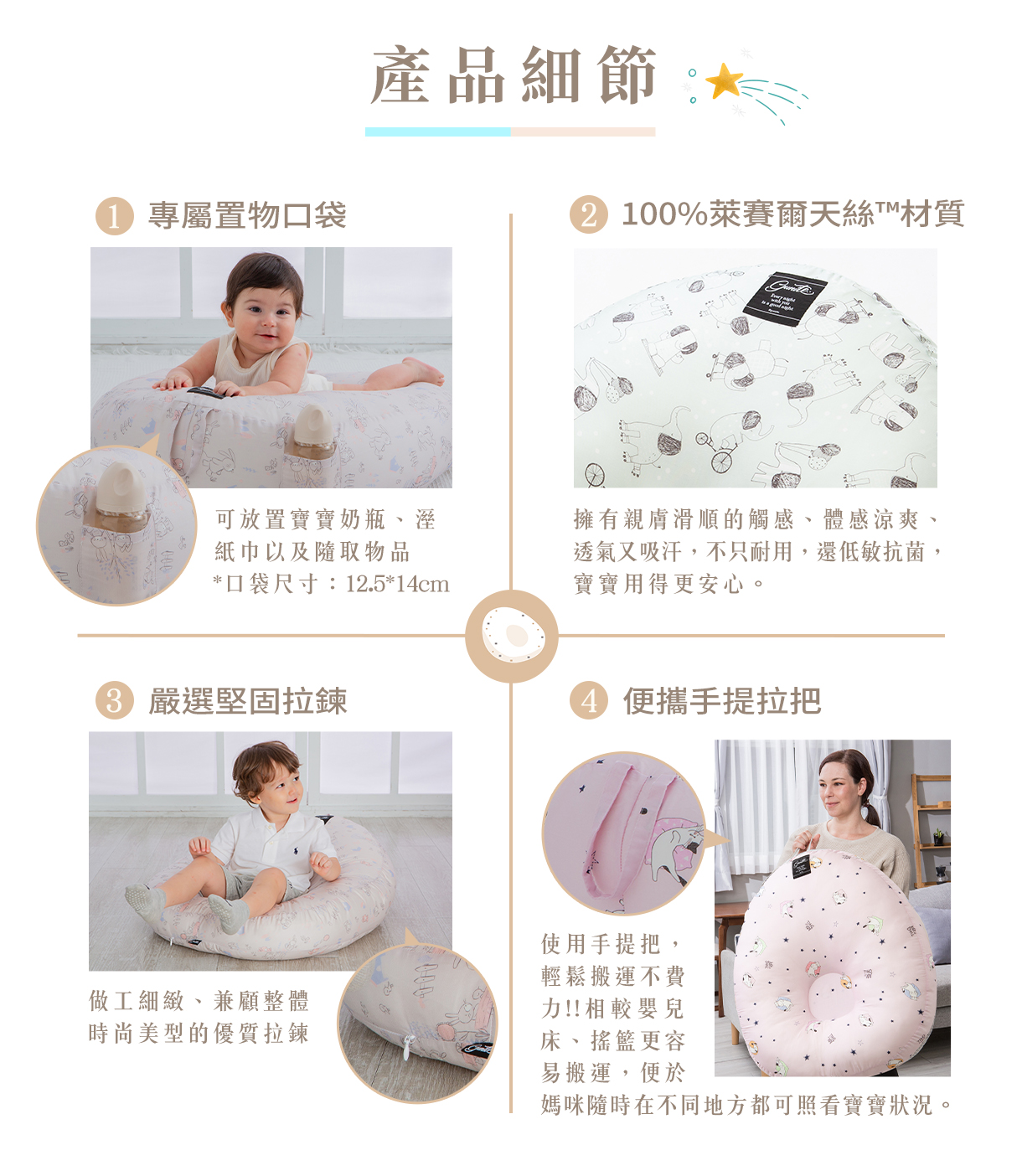 同時具備高纖維強韌度,更耐用且不易變形,低敏特性不易引起肌膚不適,也不利細菌滋生與產生靜電,是寶寶安心躺臥的理想材質。