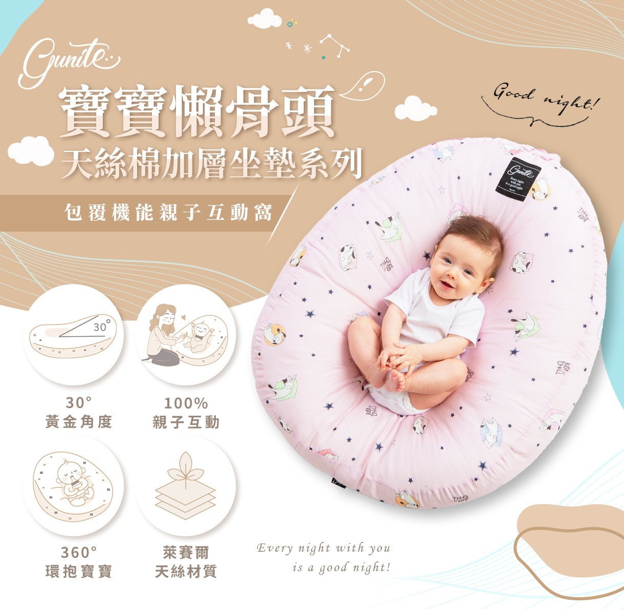 100%親子互動30°黃金仰角設計,不僅提升寶寶的舒適感,更能促進媽咪與寶貝的親子關係。理想的餵奶角度,讓寶寶在餵奶時可以與媽媽保持視線接觸,增加彼此的安全感和親密感。同時,gunite寶寶懶骨頭確保媽咪不再需要彎腰即可輕鬆餵奶,減輕了腰背的酸痛,使整個餵奶過程更加輕鬆簡單。