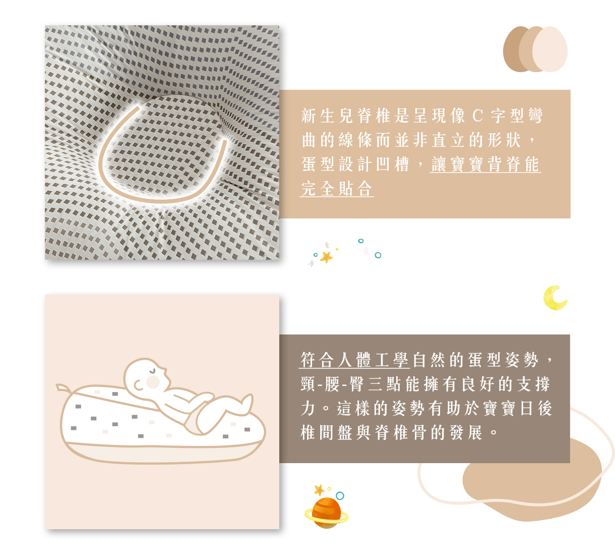 蛋型凹槽設計gunite寶寶懶骨頭採用蛋型凹槽設計,專為新生兒脊椎設計,能夠完全貼合寶寶的脊椎。蛋型凹槽符合人體工學,擁有極佳的支撐力,完美支撐住寶貝尚未發展健全的脊椎,並能有效幫助寶寶的椎間盤及脊椎骨的發展。