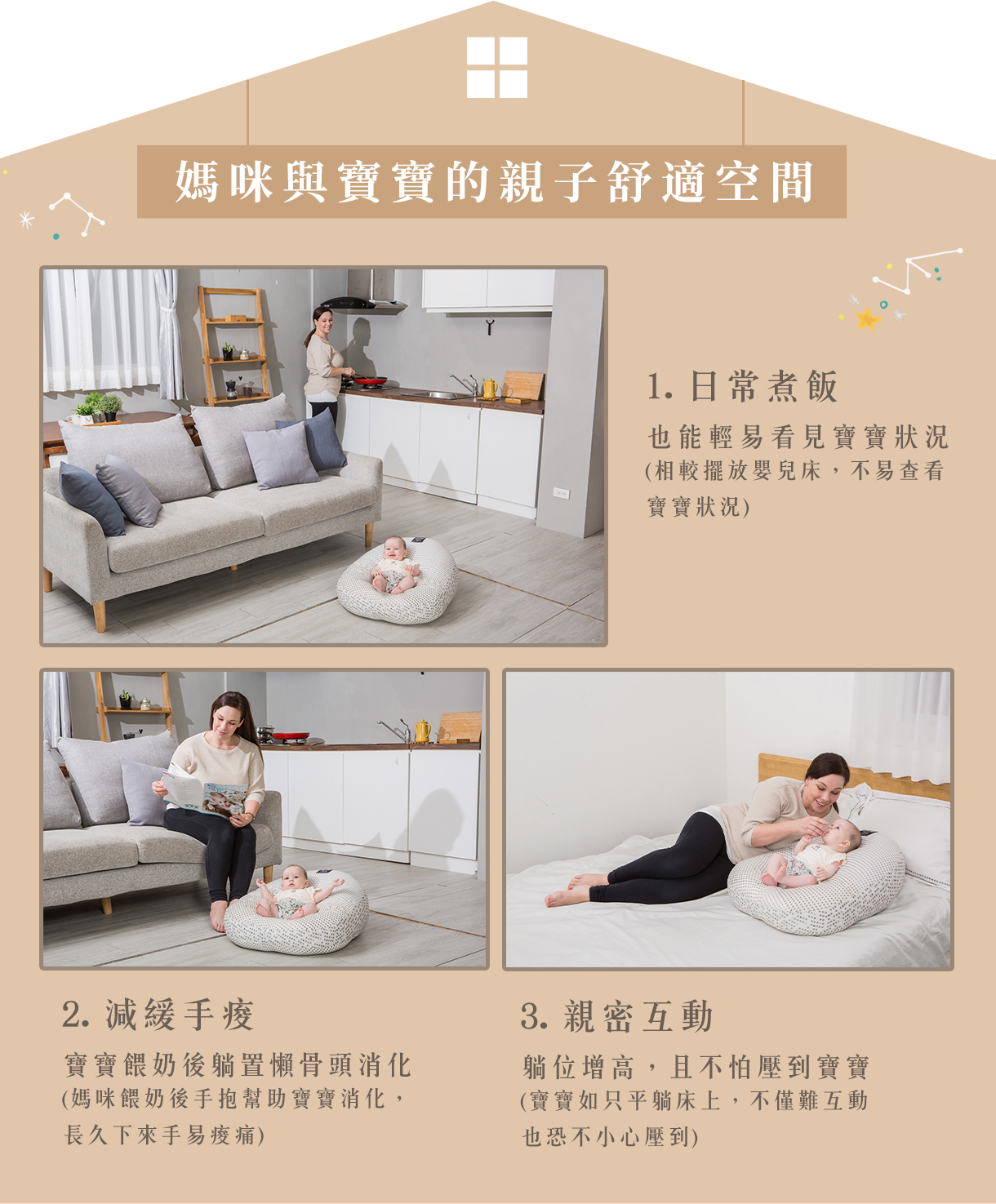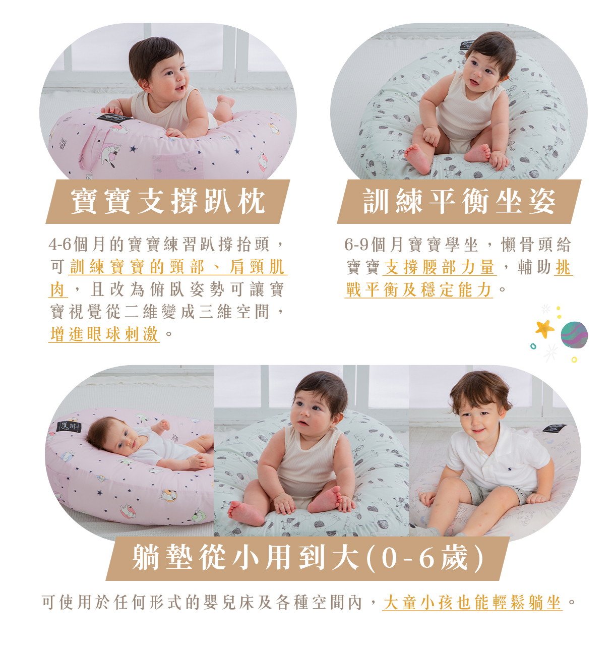 不僅新生兒能夠使用,多功能用途更能陪伴寶貝0-6歲,學趴、學坐只需要gunite寶寶懶骨頭就能搞定。