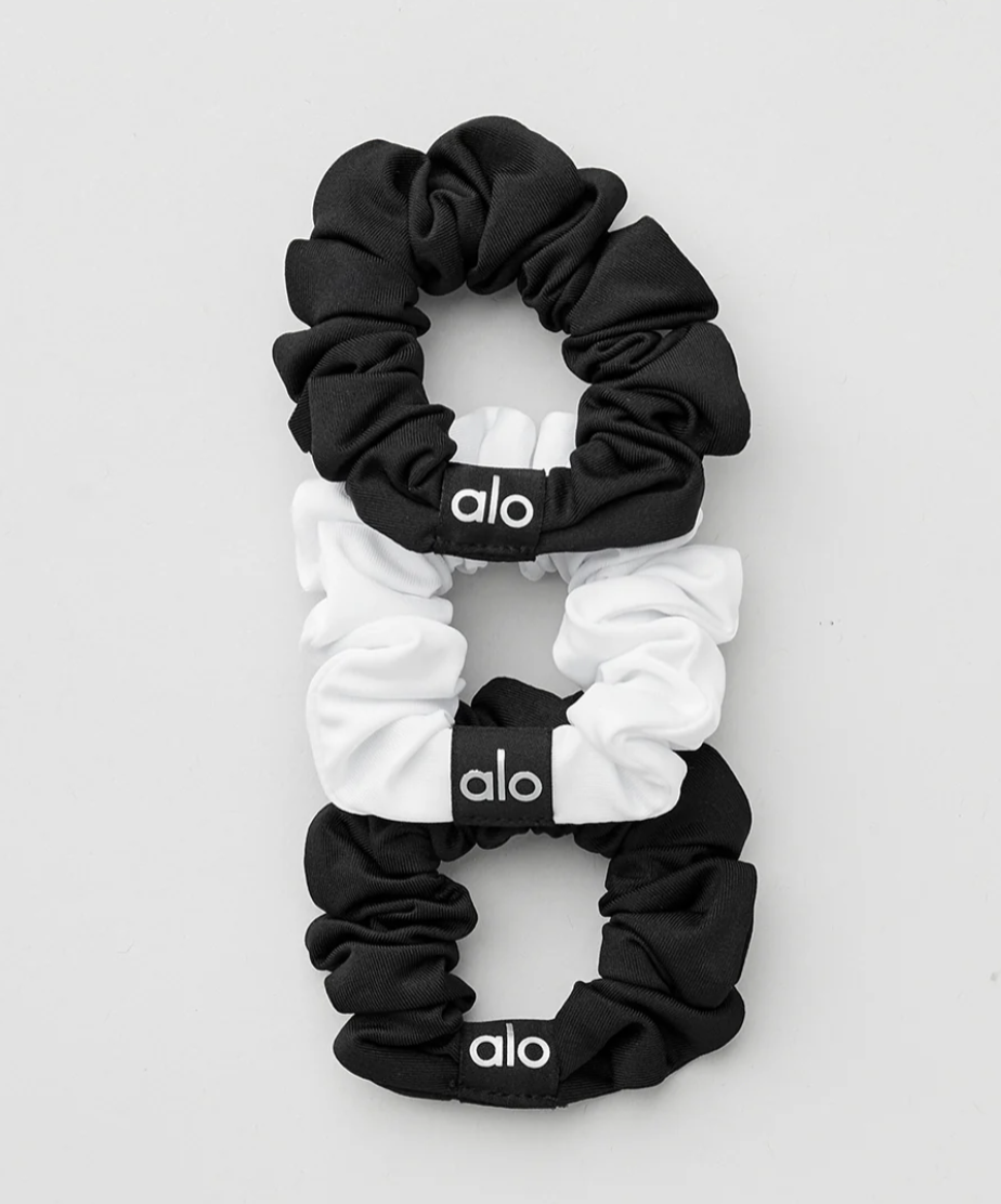Mini but mighty, these statement scrunchies help you stay focused and fashionable. Designed in our fave Airlift fabric and colors to match from head to toe. The ALO graphic detailing makes them perfect to work from studio to street.
