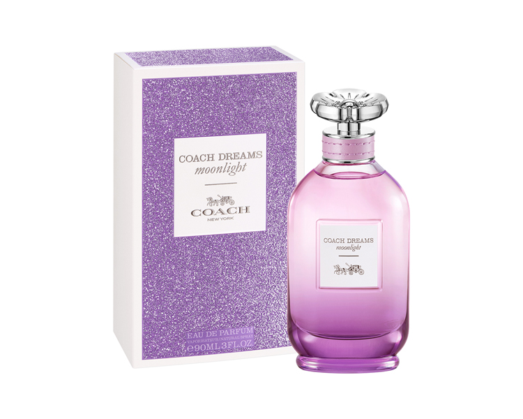 COACH DREAMS moonlight逐夢月光淡香精採用宛如復古藥瓶的外型設計,搭配紫色漸層玻璃,呼應著COACH近年愛用的色彩,也展現彷彿夜幕逐漸降下的迷人景色。明月般的銀色瓶蓋維持COACH 香氛一貫的無瓶蓋設計,使用深具代表性的茶玫瑰做為噴頭,瓶蓋下鑲嵌著COACH精湛的皮革工藝細節。外盒維持著逐夢系列的閃耀金蔥盒身,搭配與香水同色系的紫色金蔥,讓人想起夢想的魅力。