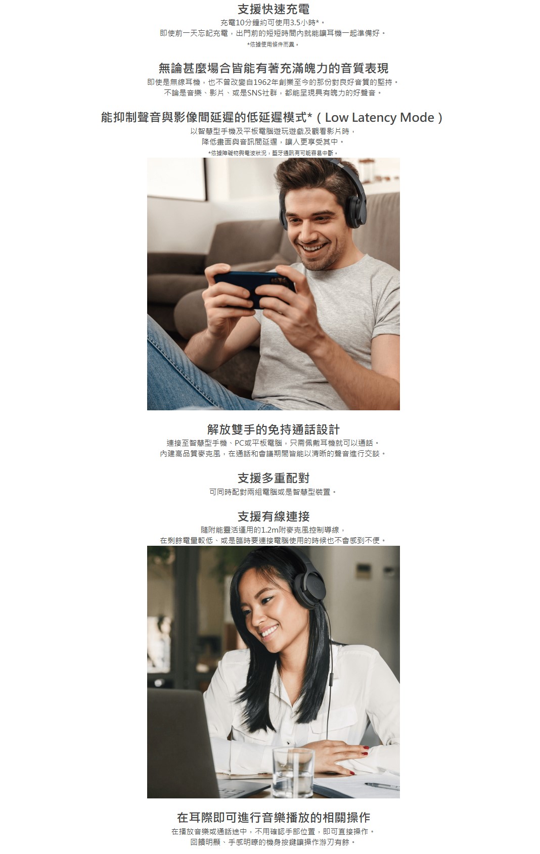 【耳機】型式:密閉動圈型驅動單元:Ø40mm輸出感度:105dB/mW頻率響應:5~32,000Hz輸入阻抗:32Ω電源型式:DC3.7V 鋰聚合物電池(內藏)充電時間:約4小時(依據使用條件而異)電池續航力:播放音樂時:最長約60小時(依據使用條件而異)工作溫度範圍:5℃~40℃重量:約180g附屬品:30cm USB 充電線(USB Type-A/ Type-C™)、1.2m智慧型手機專用導線(Ø3.5mm鍍金立體聲4極迷你插頭/ L型)