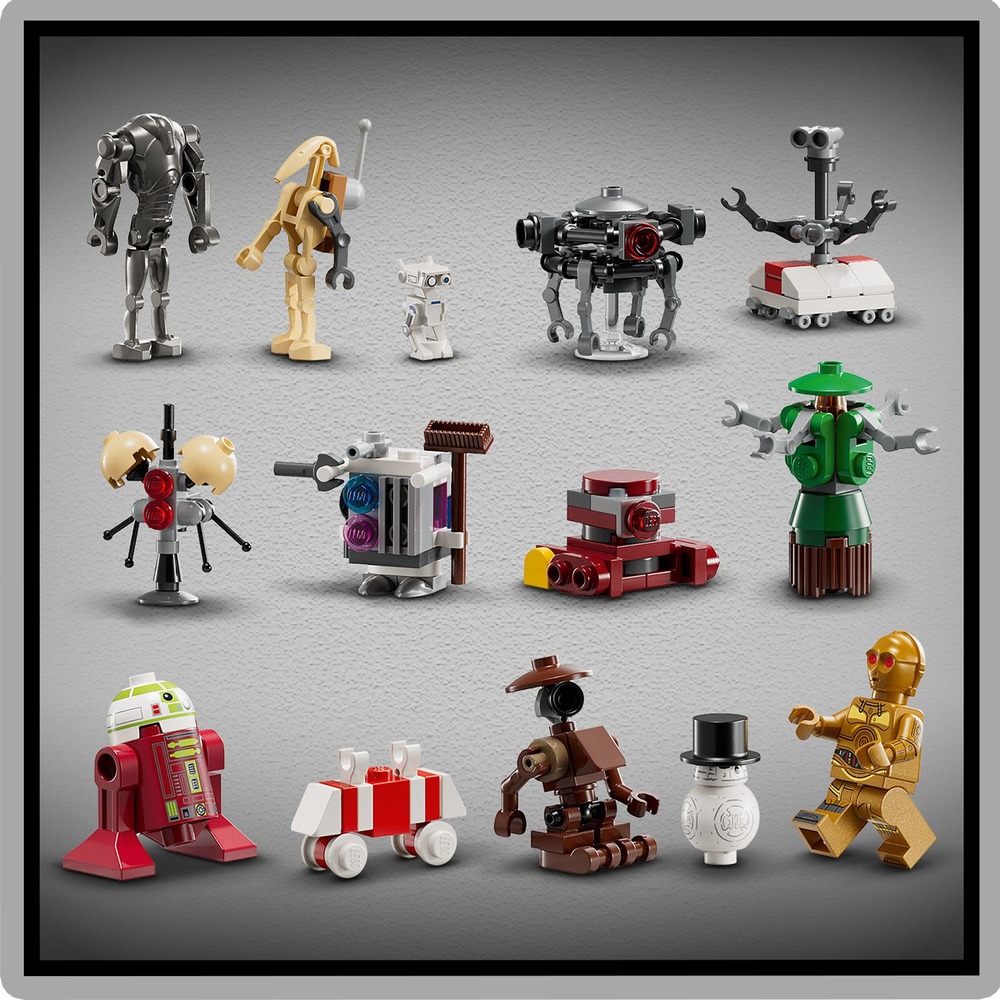 • 樂高® 星際大戰™ 2025 年驚喜月曆禮品盒組-隨著孩子在倒數耶誕節來臨期間每天發現獨特的拼砌玩具,並打造自己的機器人工坊,他們可成為像巴布佛利克一樣的機器人工匠• 樂高® 星際大戰™ 角色-C-3PO 與夾哇人(佳節)樂高人偶、巴布佛利克樂高玩偶,以及 5 個樂高機器人玩偶:R7-A7、BD-72、Scrap Battle Droid、BB-8(雪人)和超級戰鬥機器人• 8 個拼砌式樂高® 機器人-維修機器人、剛克機器人、醫療機器人(佳節)、B2EMO、崔德威機器人、老鼠機器人(佳節)與探查機器人• 9 個迷你模型玩具-工作台、椅子、工具架、架子、1 箱額外機器人組件、起重機和桶子,可打造機器人工匠的工坊,此外還有夾哇人拼砌式載具與耶誕樹• 適合 6 歲以上孩子的樂高® 星際大戰™ 耶誕禮品盒組-此驚喜月曆適合送給男孩、女孩與星際大戰粉絲,當作趣味耶誕好禮• 拼砌與遊玩-這款可量身打造的盒組裡的迷你模型和角色可搭配其他樂高® 星際大戰™ 系列盒組(另售)一起使用,創作無數故事• 樂高® 星際大戰™ 收藏品-樂高星際大戰系列拼砌盒組讓大小粉絲能重現經典場景、暢玩角色扮演,上演自己的科幻冒險,或單純展示積木組成的模型• 適合孩子、朋友與家庭的耶誕活動-這款由 263 個零件組成的驚喜月曆適合孩子獨自拼砌和遊玩,也很適合朋友同樂,或當作家人增進感情的佳節活動