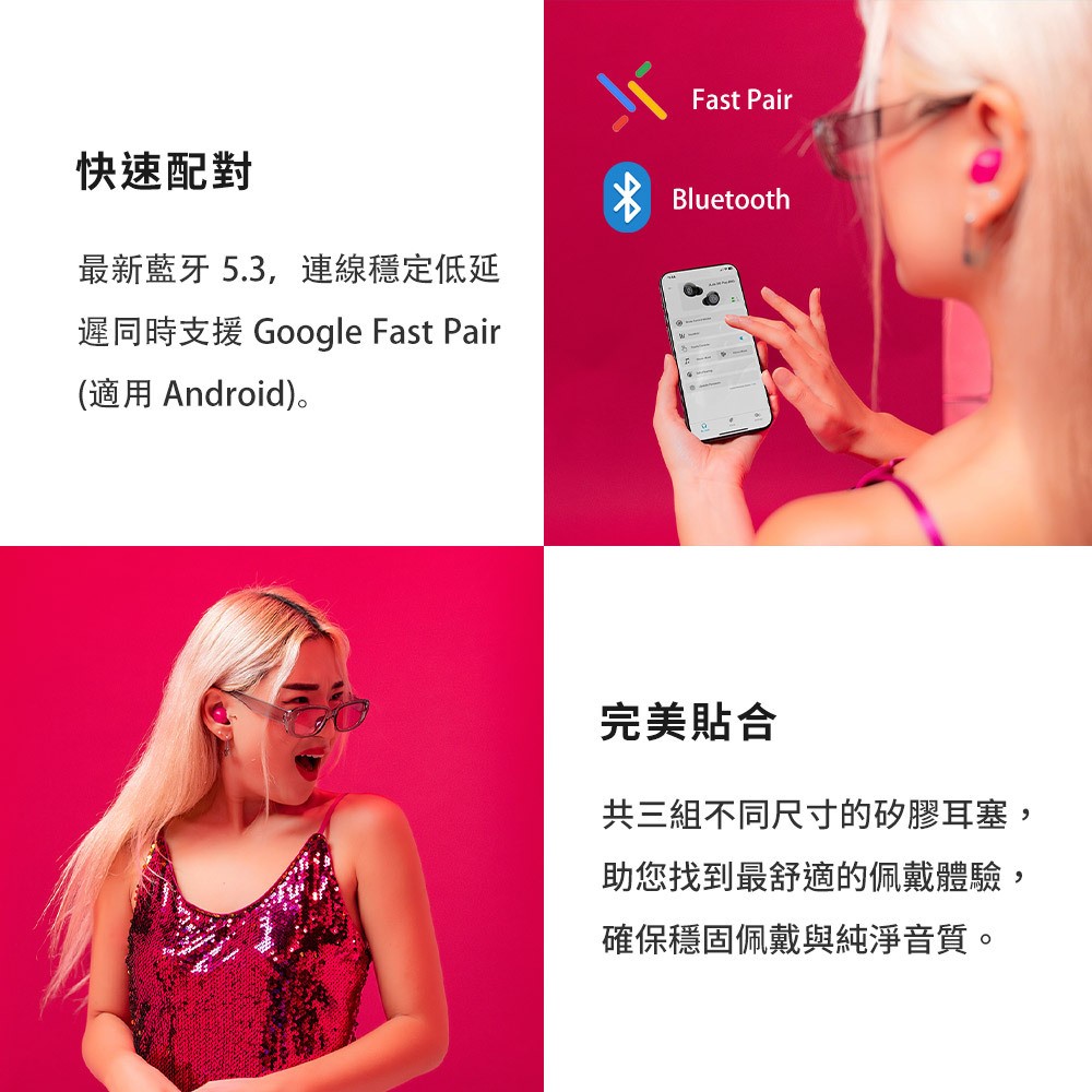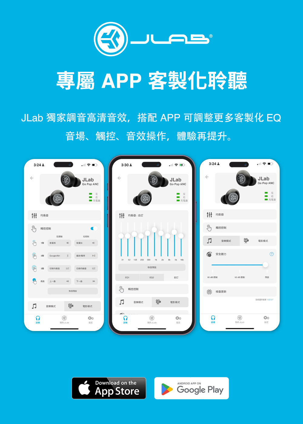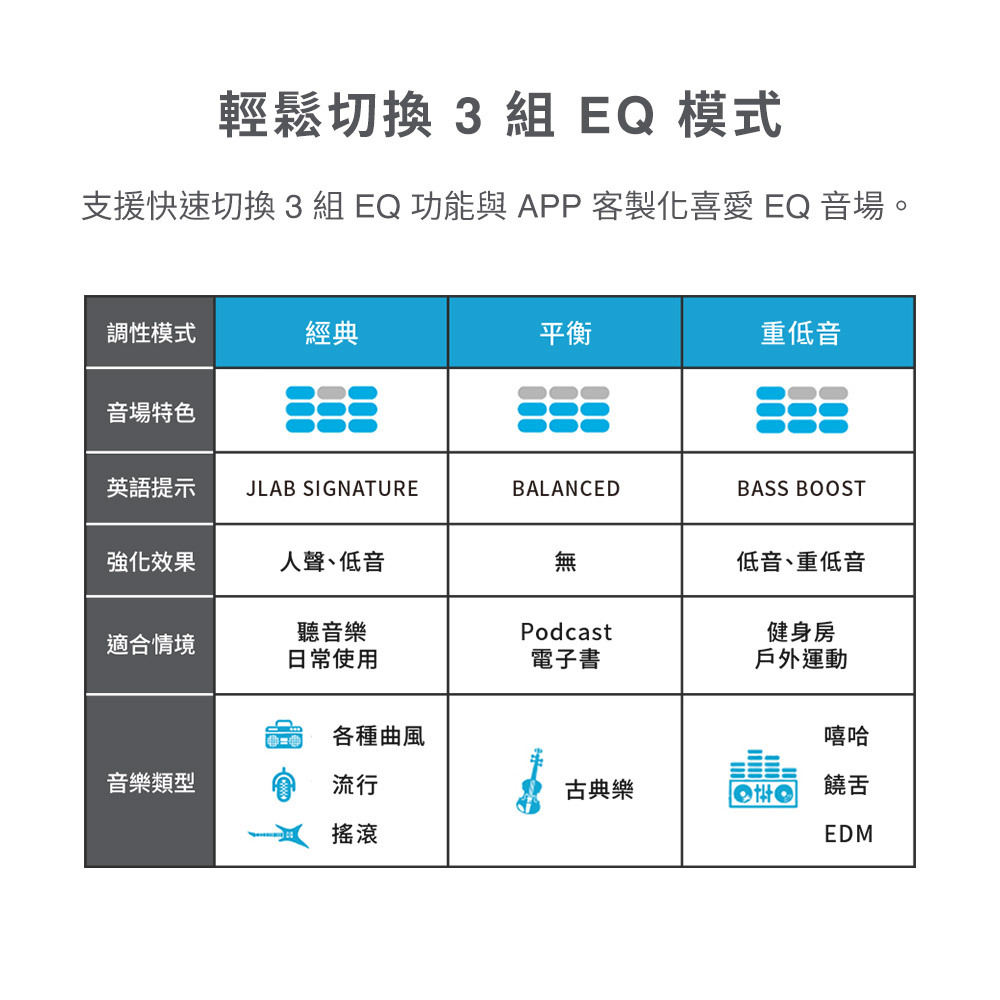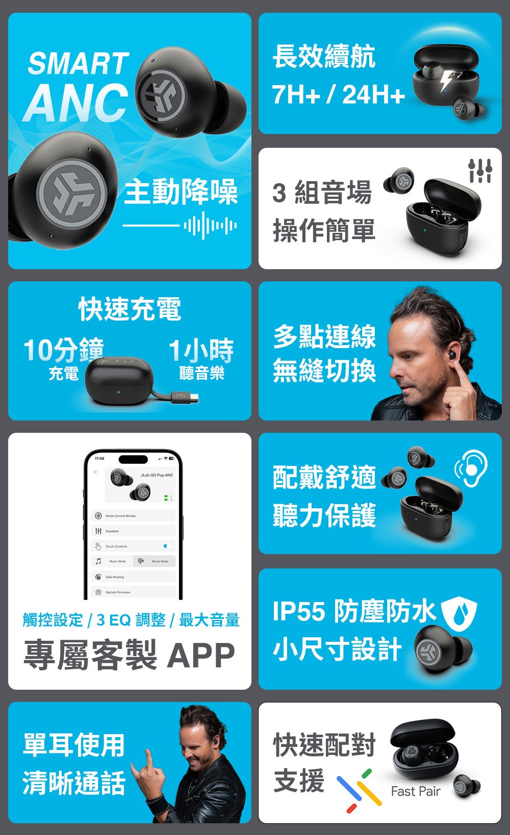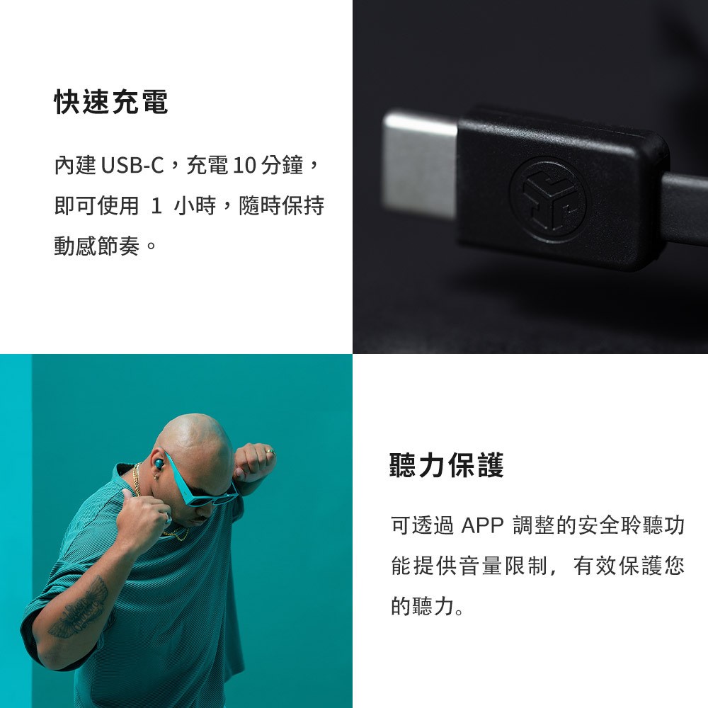 主動降噪|三種模式透過JLab APP隨心切換高清音質|10mm動圈單體,聲音清晰高解析持久續航|單次電力7H+,搭充電盒24H+客製調整|JLab App個性控制EQ音場、降噪等快速充電|充電10分鐘使用1小時,音樂不間斷聽力保護|APP可調整最大音量,保護耳朵多點連線|輕鬆實現設備間的無縫切換運動防水| IP55 防汗防潑水完美陪伴清晰通話|降噪技術結合數位MEMS麥克風單耳使用|雙耳機連線模式,支援單耳3 組音場|三組音場快速切換,亦可APP客製化快速配對|支援Google Fast Pair(適用Android)充電方便|充電盒內建Type-C線,出門免帶線輕巧舒適|超纖薄小巧,入耳貼合,攜帶方便