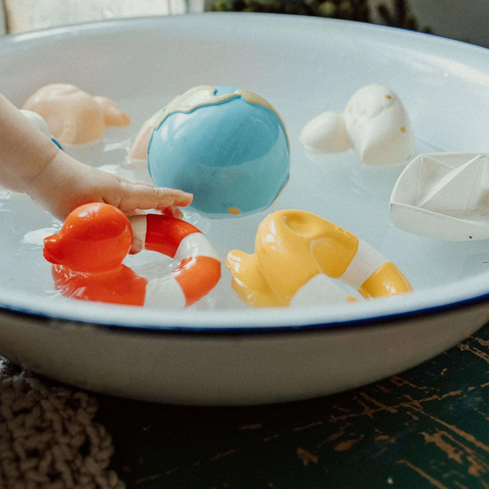 以 100% 天然乳膠製成,無孔設計讓寶寶連洗澡時都能安心玩樂。
