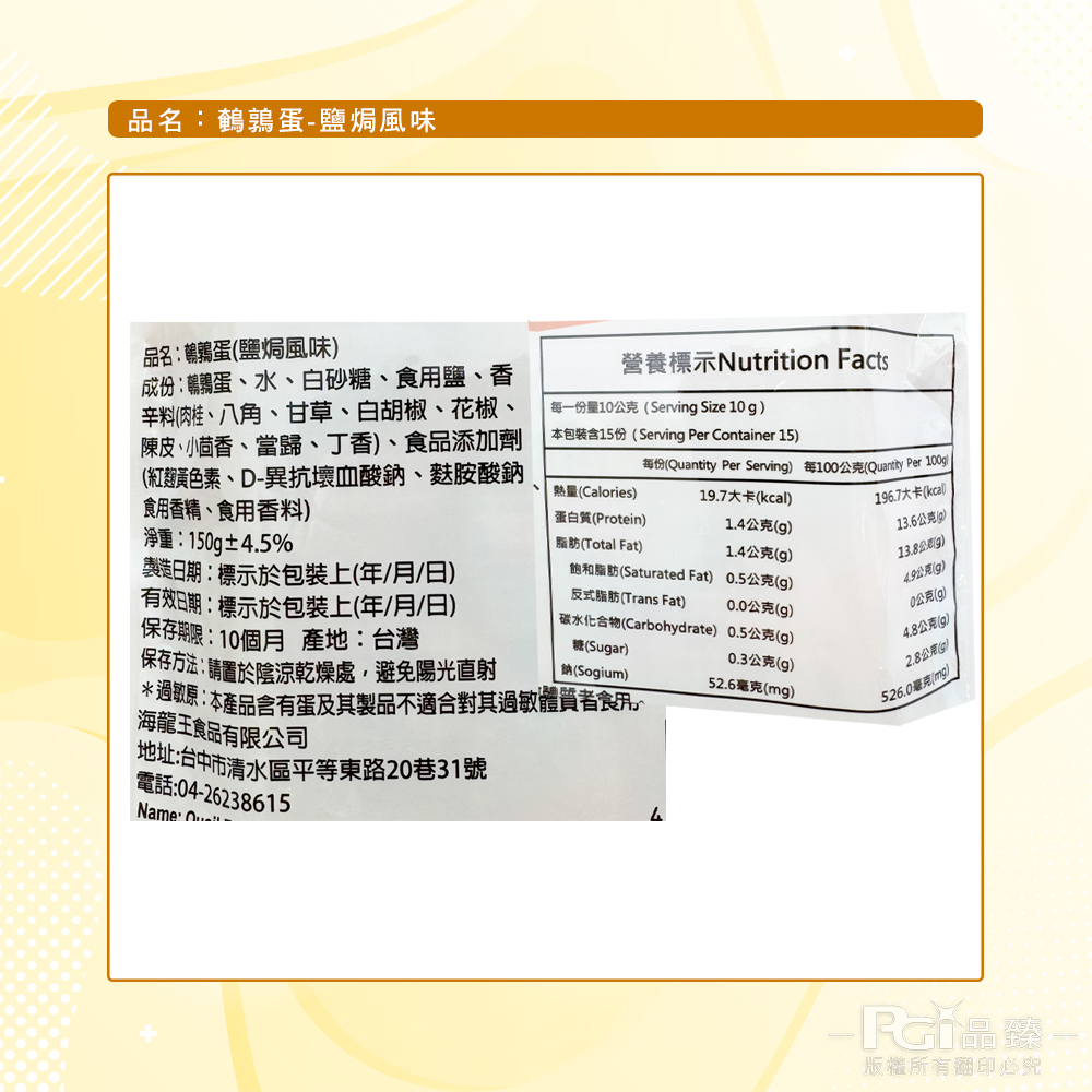 1.商品組合/規格:【海龍王】鵪鶉蛋(150g)(3包/組)2.商品品名:海龍王】鵪鶉蛋(150g)(3包/組)-鹽焗/香辣/綜合3.商品重(容)量:150g±4.5%/包4.內容物成分:◆香辣風味:鵪鶉蛋、水、白砂糖、食用鹽、辣椒、香辛料(肉桂、八角、甘草、白胡椒、花椒、陳皮、小茴香、當歸、丁香)、食品添加劑(紅麹黃色素、D-異抗壞血酸鈉、麩胺酸鈉、食用香精、食用香料)◆鹽焗風味:鵪鶉蛋、水、白砂糖、食用鹽、香辛料(肉桂、八角、甘草、白胡椒、花椒、陳皮、小茴香、當歸、丁香)、食品添加劑(紅麹黃色素、D-異抗壞血酸鈉、麩胺酸鈉、食用香精、食用香料)※本產品含有蛋及其製品不適合對其過敏體質者食用5.原產地(國):台灣6.保存期限:10個月(實際依商品包裝標示)7.製造廠商或國內負責廠商名稱:品臻國際行銷有限公司8.製造廠商或國內負責廠商地址:台北市中山區民生東路一段43號7樓9.製造廠商或國內負責廠商電話:02-8861-520810.食品業者登錄字號:A-127757268-00001-311.投保產品責任險字號:富邦產物0510字第25AML0000316號