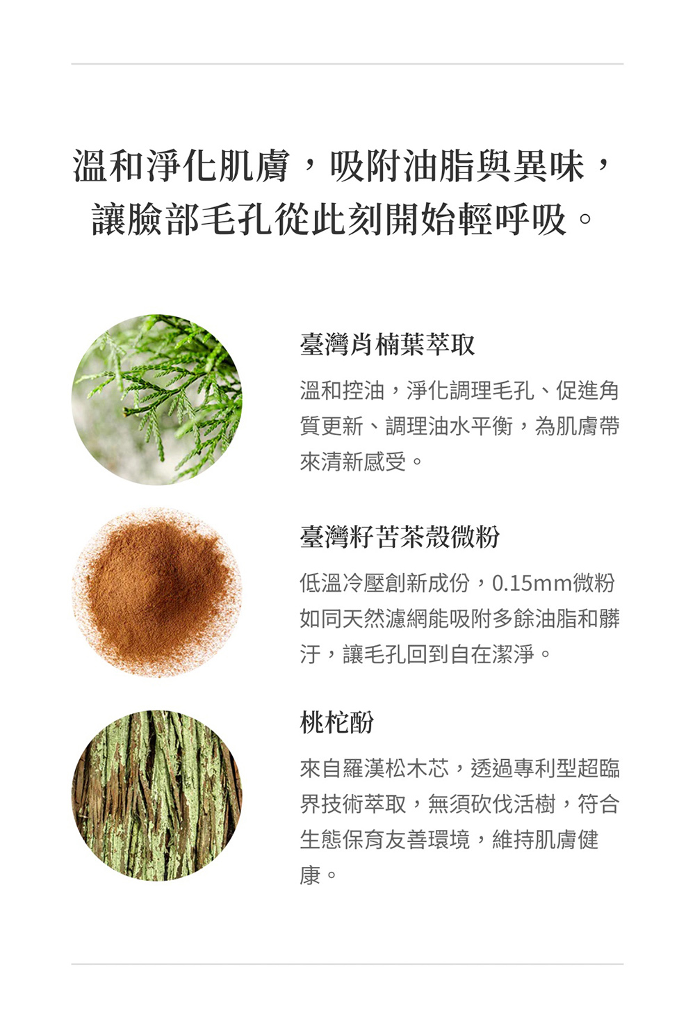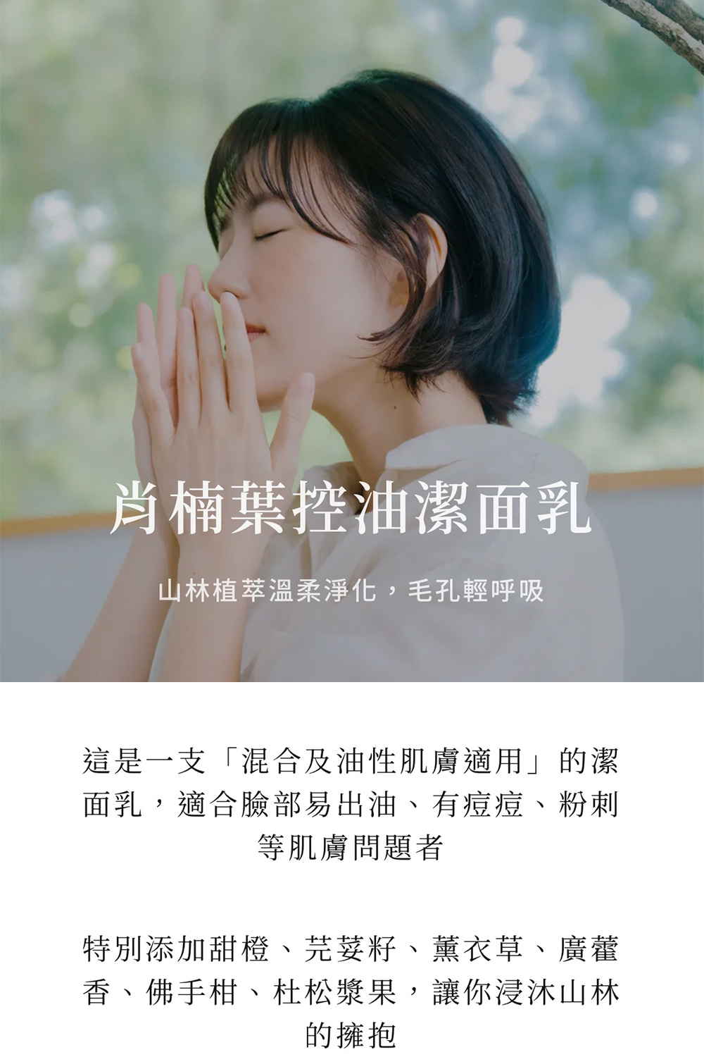 #混合性與油肌適用#肌膚毛孔輕呼吸 • 幫助角質代謝,淨化毛孔,油水平衡 • 創新成分,0.15mm微粉能吸附多餘油脂和髒汙 • 蘊含天然茶皂素,溫和清潔,友善環境 • 絲綢乳霜質地,清爽舒適不緊繃、溫和潔淨不乾澀 #油性肌調理救星 #黃金三角呵護 • 增強肌膚防禦力,抵擋環境傷害 • 滋潤修護,撫平肌膚細紋 • 補水潤澤,為肌膚形成一層保護膜 • 敞開身心走入山林,擁抱樹、大地與自己,堅定前行