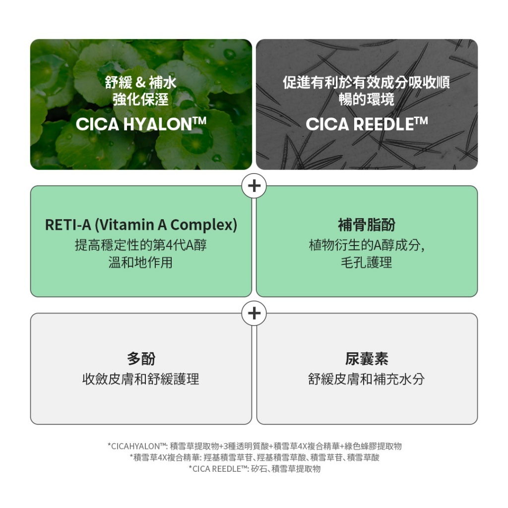 --- 積雪草提取物 + 三種透明質酸 + 積雪草4X複合物 + 綠色蜂膠提取物