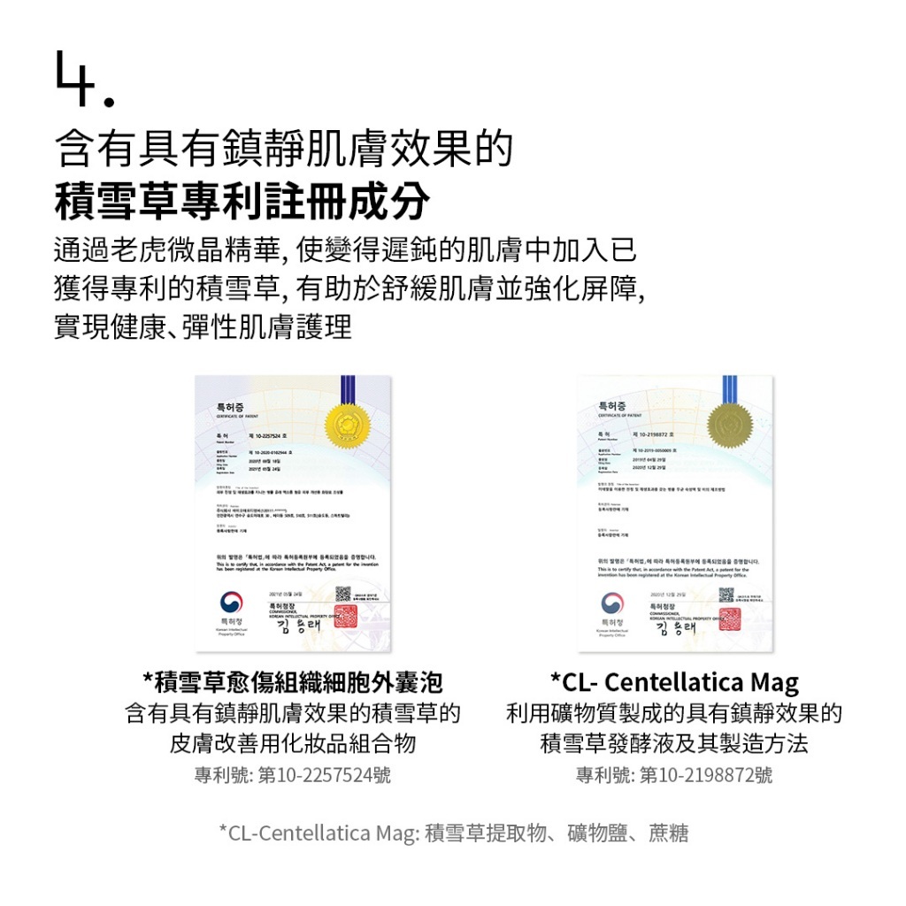 - 積雪草提取物 + 三種透明質酸 + 積雪草4X複合物 + 綠色蜂膠提取物