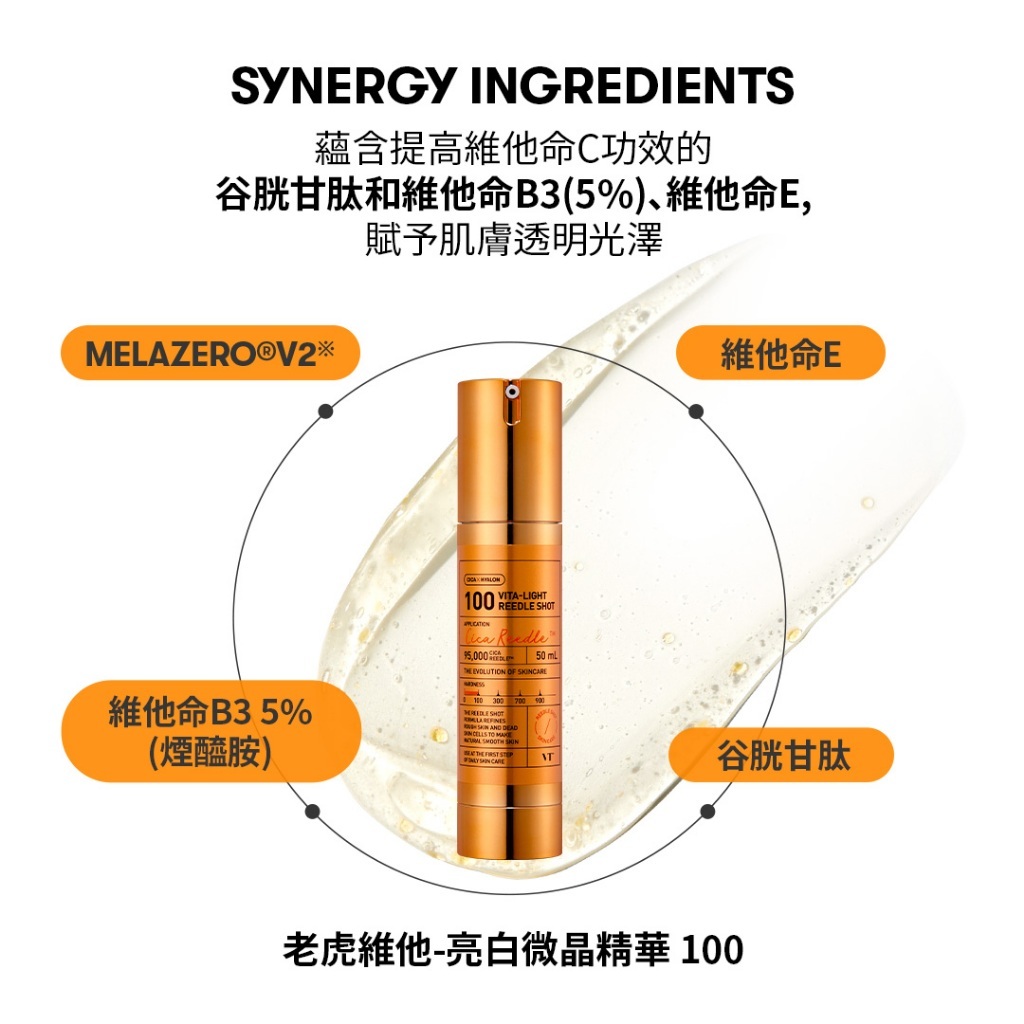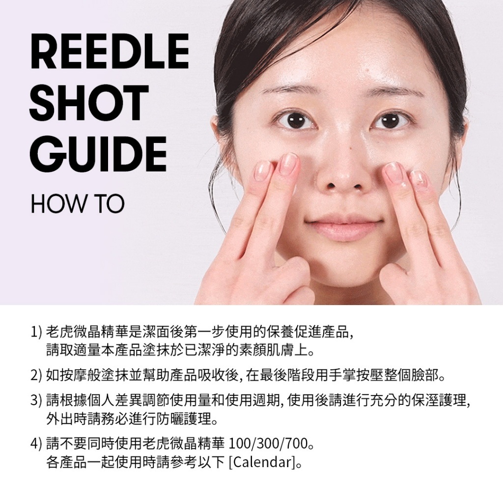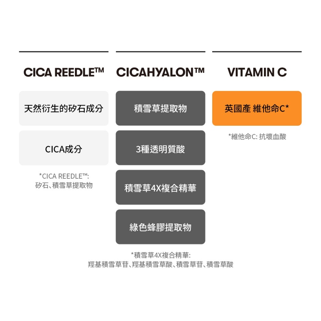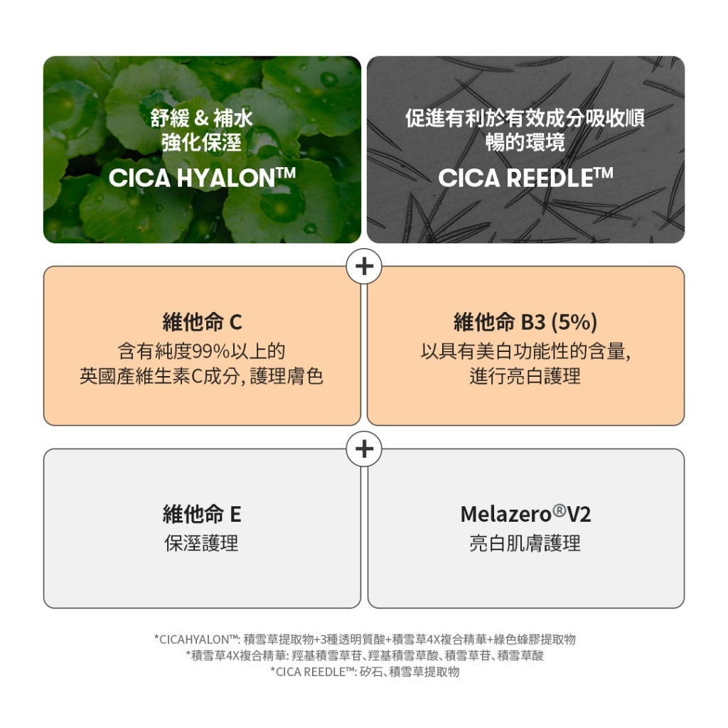 1. 維他命 X CICA 協同作用! 強化亮白護理專家 Reedle Shot: 添加純英國來源的維他命C和高濃度(5%)的煙酰胺(維他命B3), 以發揮最大功效