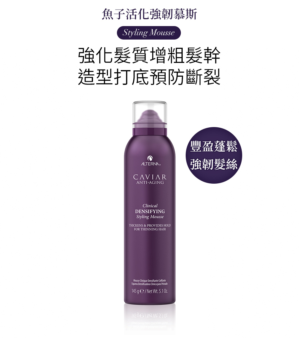 .輕盈慕斯質地,濕髮打底不黏膩,紅花苜宿萃取精華,增粗髮幹直徑,輕度支撐力,打造豐厚髮量效果