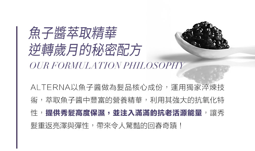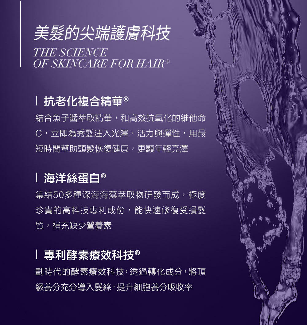 .抗老化複合精華®:結合魚子醬萃取精華,恢復秀髮光澤與彈性.專利酵素療效科技®:提升頭髮吸收力,促進角蛋白生成.海洋絲蛋白®:萃取自深海海藻,快速修復受損髮絲