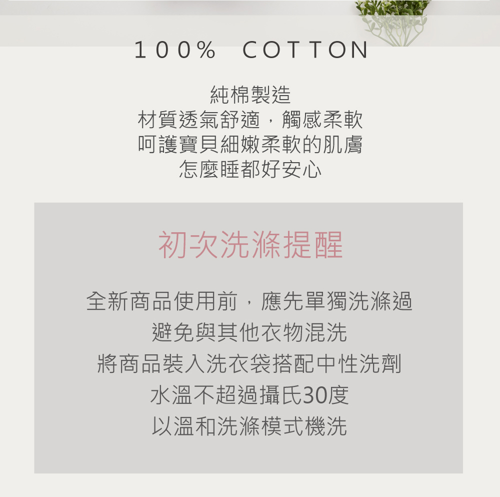親膚材質:100%純棉製造,材質透氣舒適,觸感柔軟,呵護寶貝細嫩柔軟的肌膚,怎麼睡都好安心。