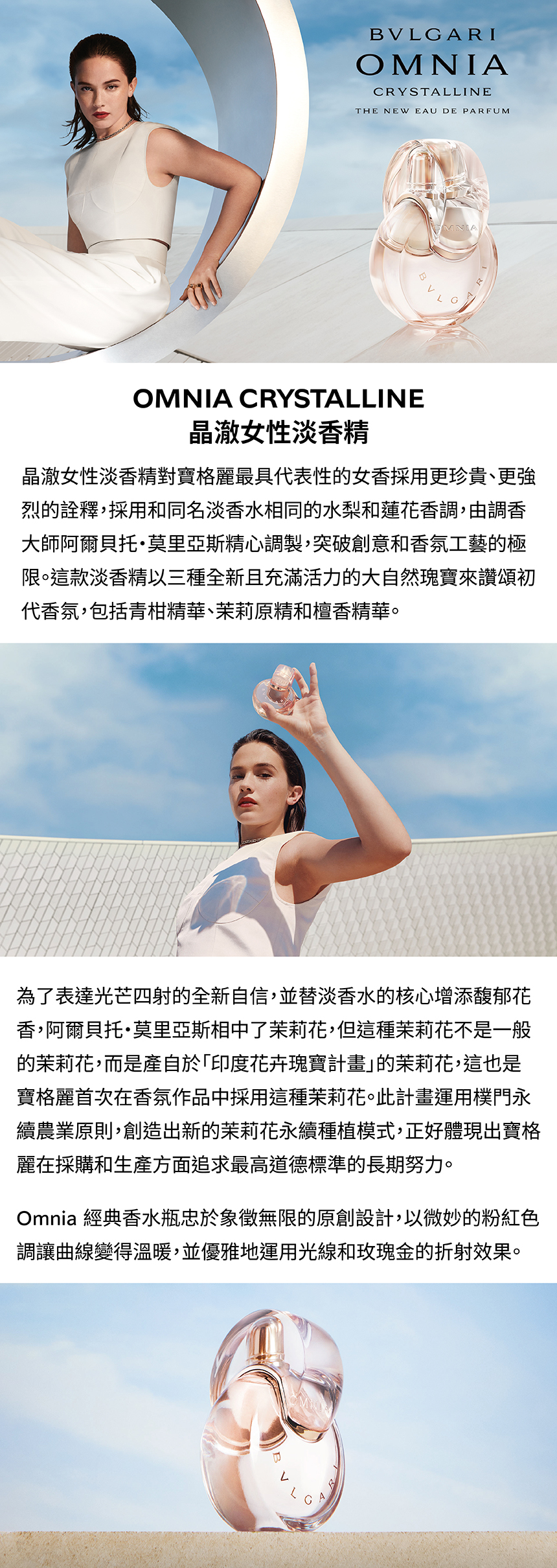 晶澈女性淡香水擁有清新明亮的香氣,其靈感源自晶瑩剔透的水晶,讓人聯想起蓮花的透明感、水梨的清新果香與波薩木的柔滑質感。花香木質調前 味:水梨、綠竹中 味:蓮花後 味:波薩木、水晶麝香