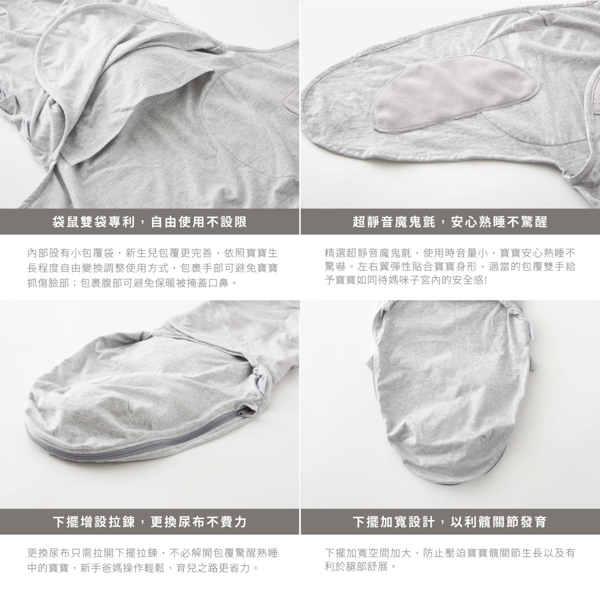 功能:1. 嚴選「超靜音魔鬼氈」有別於一般魔鬼氈,材質柔軟不刮傷嫩嬰皮膚,穿脫無聲 2. 袋鼠雙袋專利|超靜音魔鬼氈|下擺增設拉鍊|國際髖關節協會認證 腿部加寬設計 3. 有別於傳統包巾,將操作複雜的包法簡化,模擬子宮內的環境緊緊包覆,讓寶寶安心睡過夜