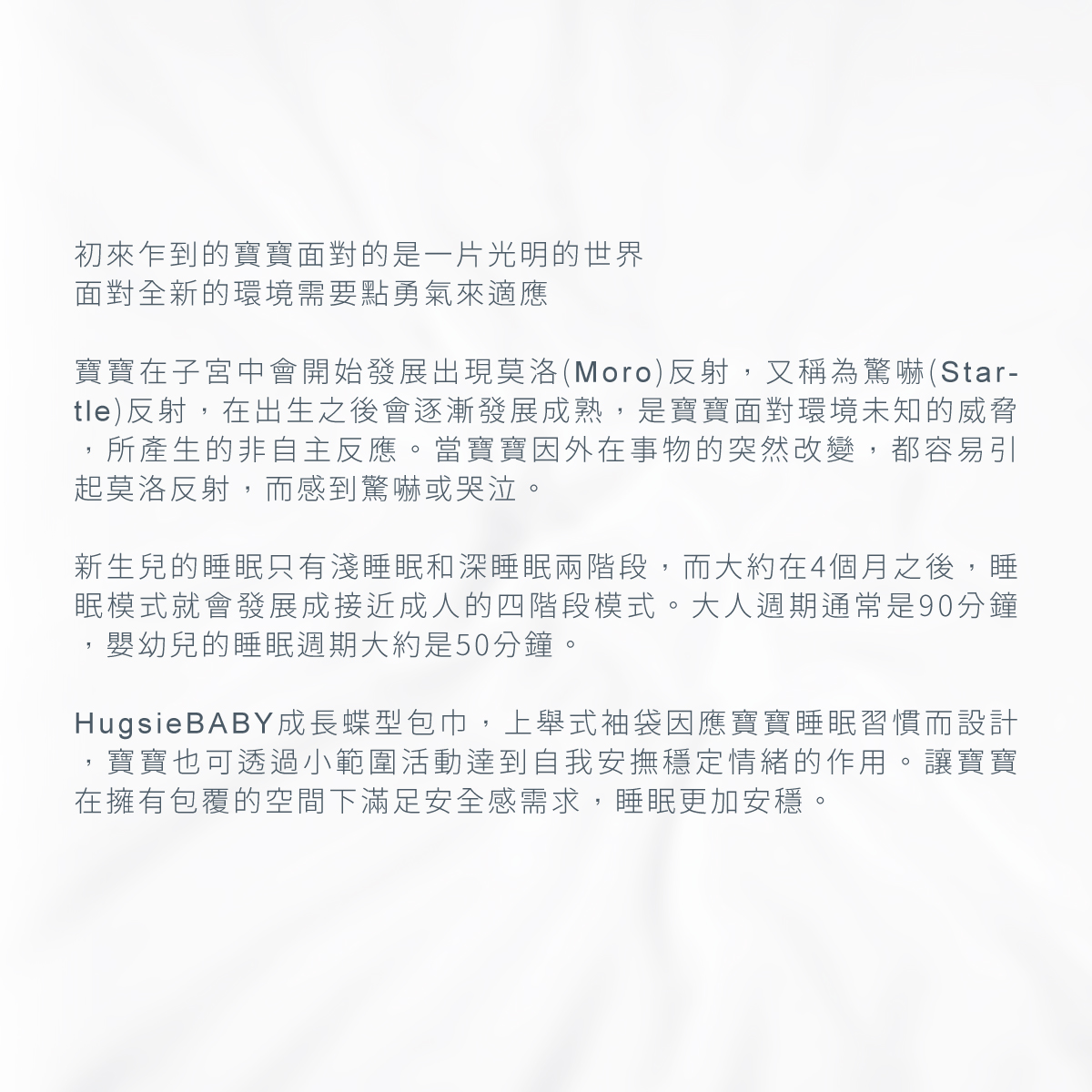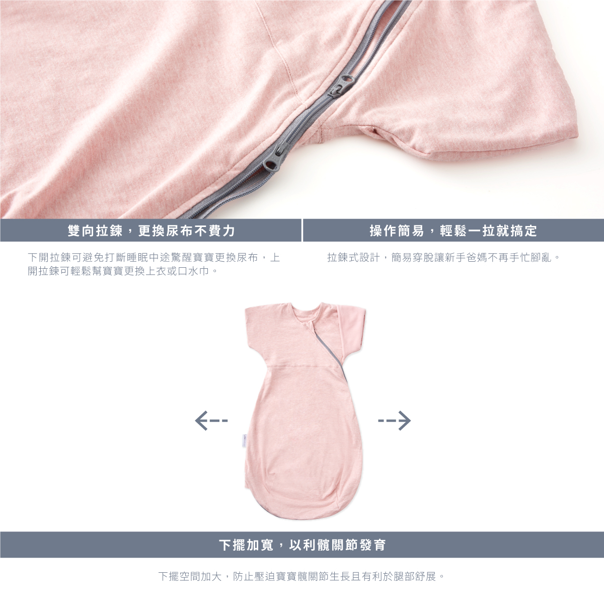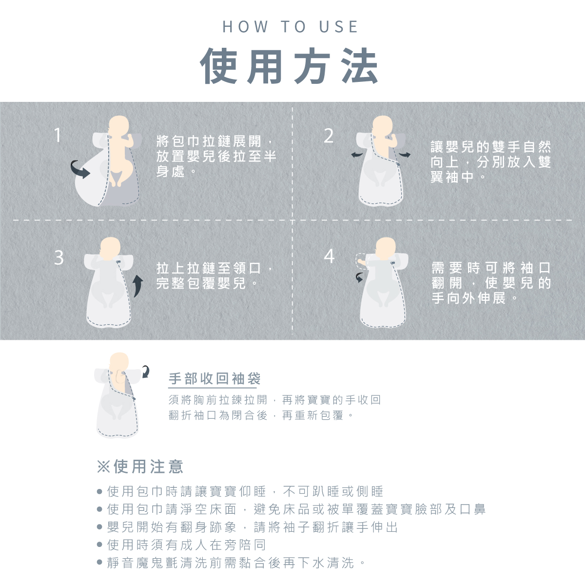 功能:1. 依照寶寶睡眠習慣的上舉式蝶型設計,安全感包覆延長睡眠時間 2. 蝶型設計|兩用袖口|雙向拉鍊簡易穿脫|國際髖關節協會認證 腿部加寬設計 3. 簡易操作的懶人包巾,訓練睡眠儀式,完整包覆穩定情緒睡過夜