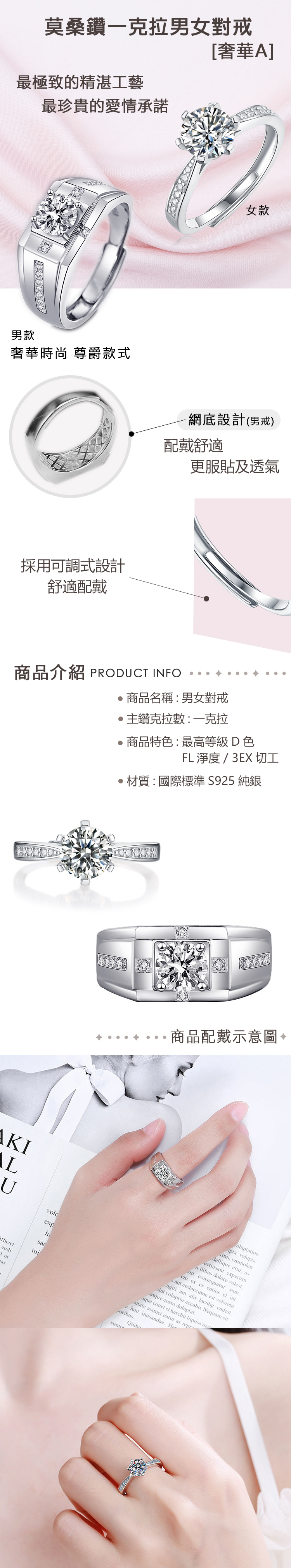 | 商品內容 | 名稱:奢華A《莫桑鑽一克拉男女對戒》