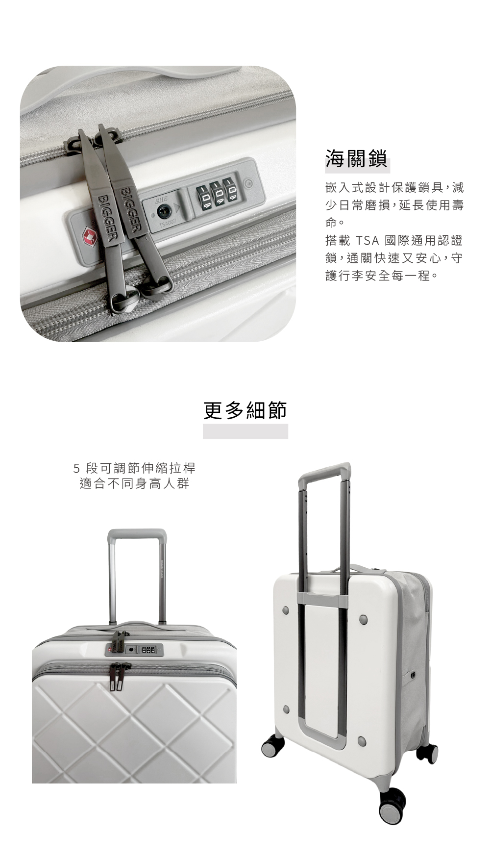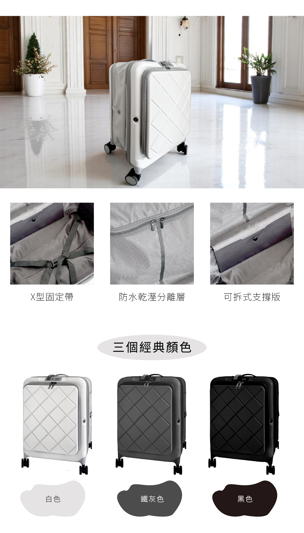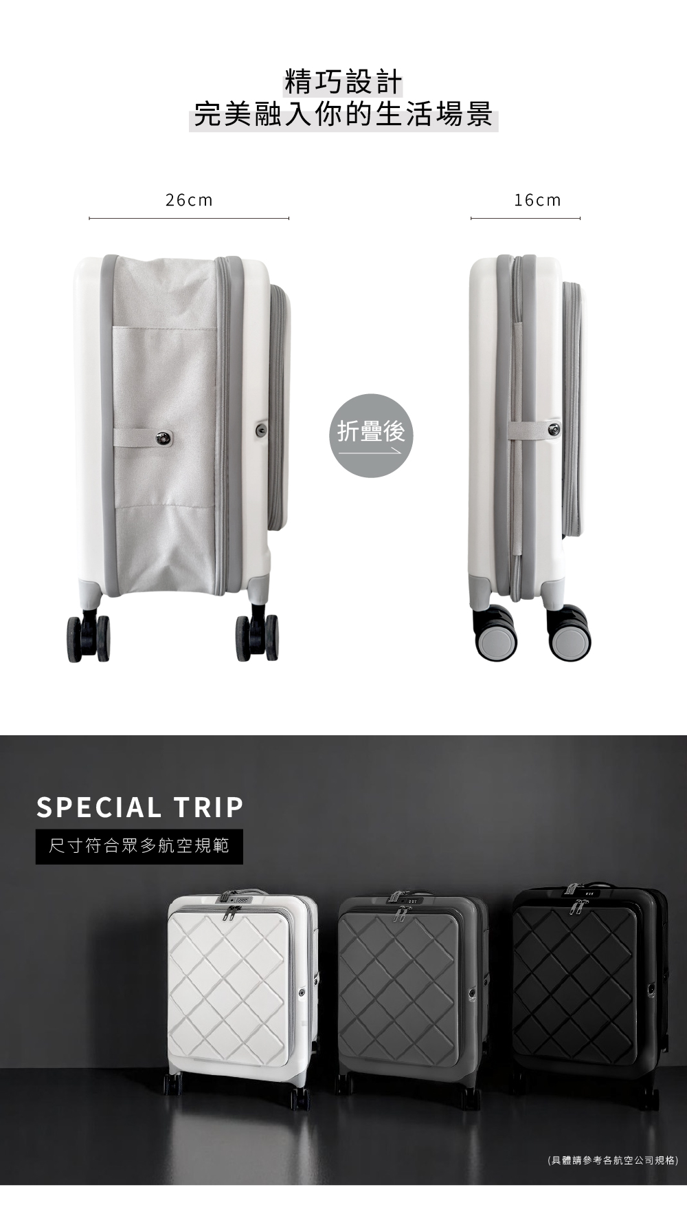 ★ 一年保固,兩年保修 。★ 國際認證 | TSA海關安全鎖。★ 重量輕巧|多數折疊行李箱使用輕量材質。★ 四輪萬向滑輪 | 滑行平穩、轉向靈活,適合城市移動、地鐵、機場使用。★ 多樣收納隔層|內部通常有分層、拉鍊袋,便於分類收納衣物、3C、化妝品等。★ 不佔空間 | 折疊後體積大幅縮小,適合居家收納或旅途中不使用時收納於車廂、櫃子等空間。★ 彈性容量|有些款式折疊厚度可調整,展開後容量充足,短途2~4天旅行衣物足夠裝載。★ 防潑水設計 | 部分折疊箱採用防潑水布料或硬殼設計,旅途中不怕小雨濕到行李。【商品規格】・尺寸:20吋