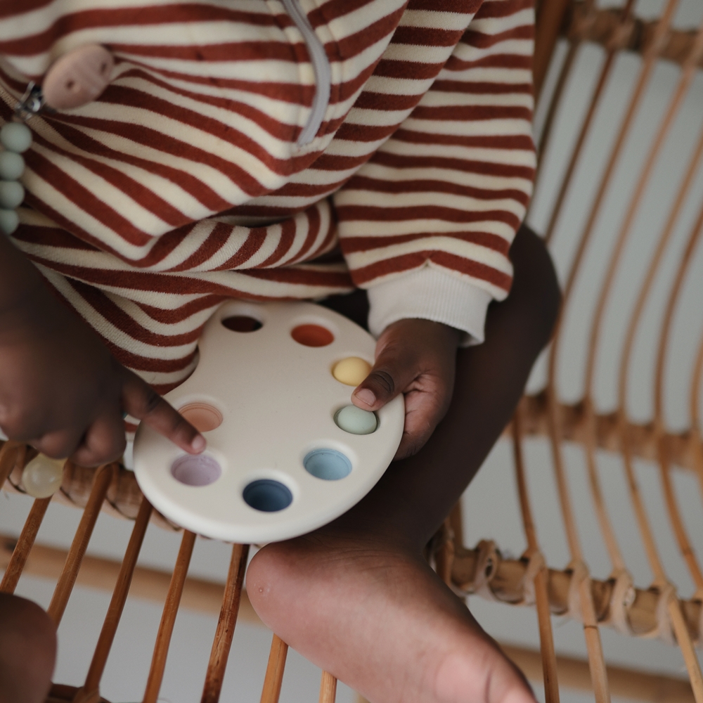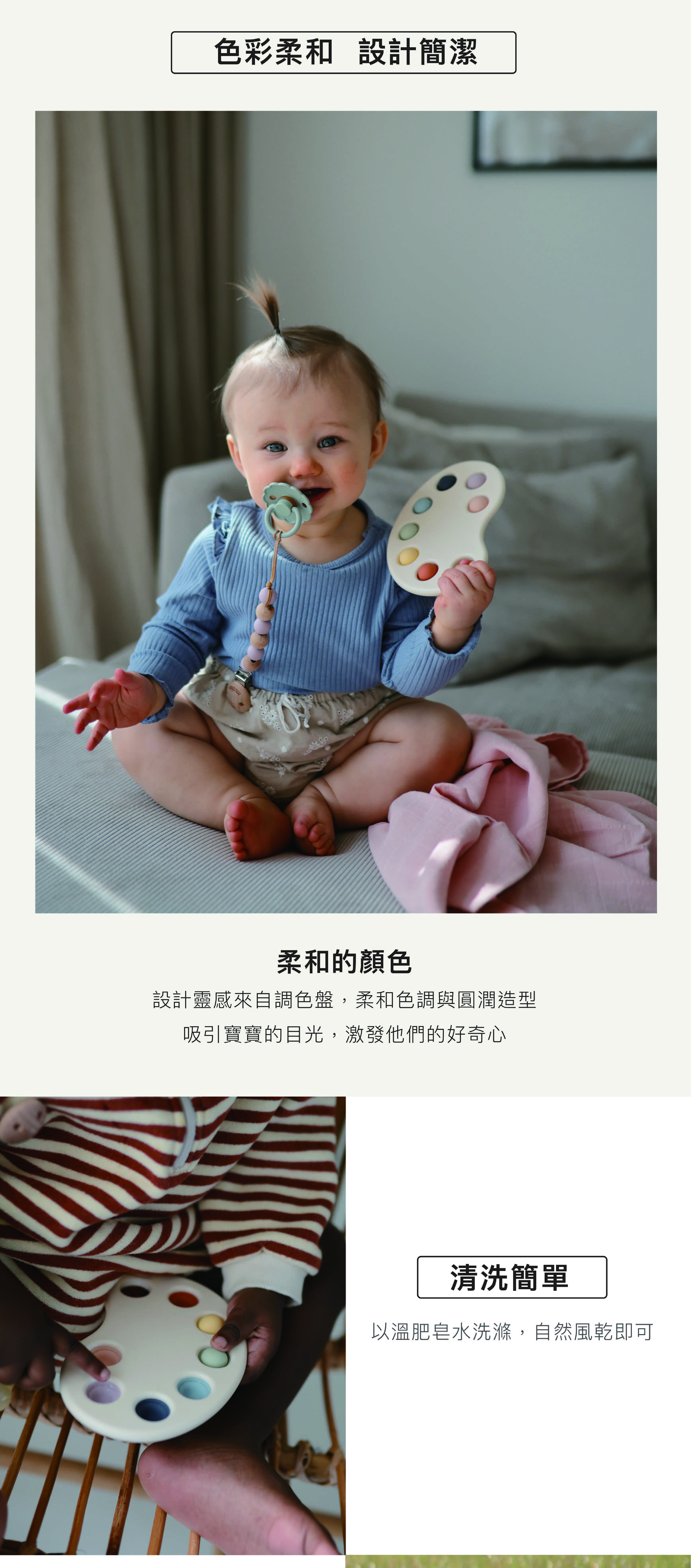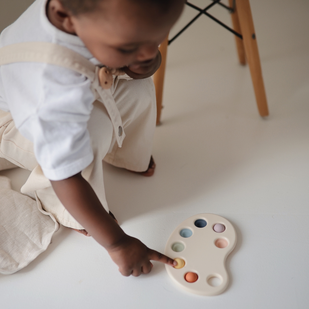 mushie的調色盤按壓玩具透過簡單的設計和柔和的色彩,鼓勵寶寶進行感官探索並發展精細動作技能。它採用食品級矽膠和無 BPA 塑膠框架,孩子們在按壓泡泡並聽到輕微的「啪」聲時,會進一步啟發學習,在觸覺、視覺與聽覺都能受到刺激。