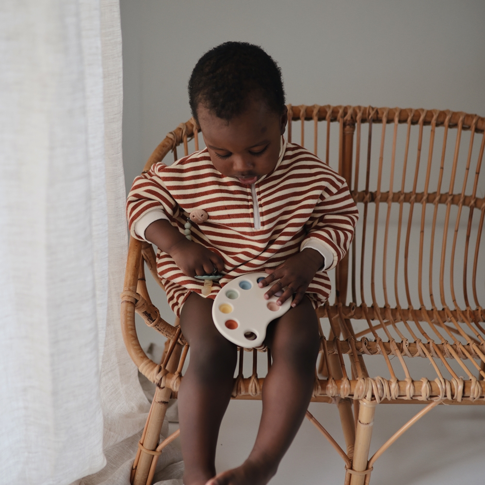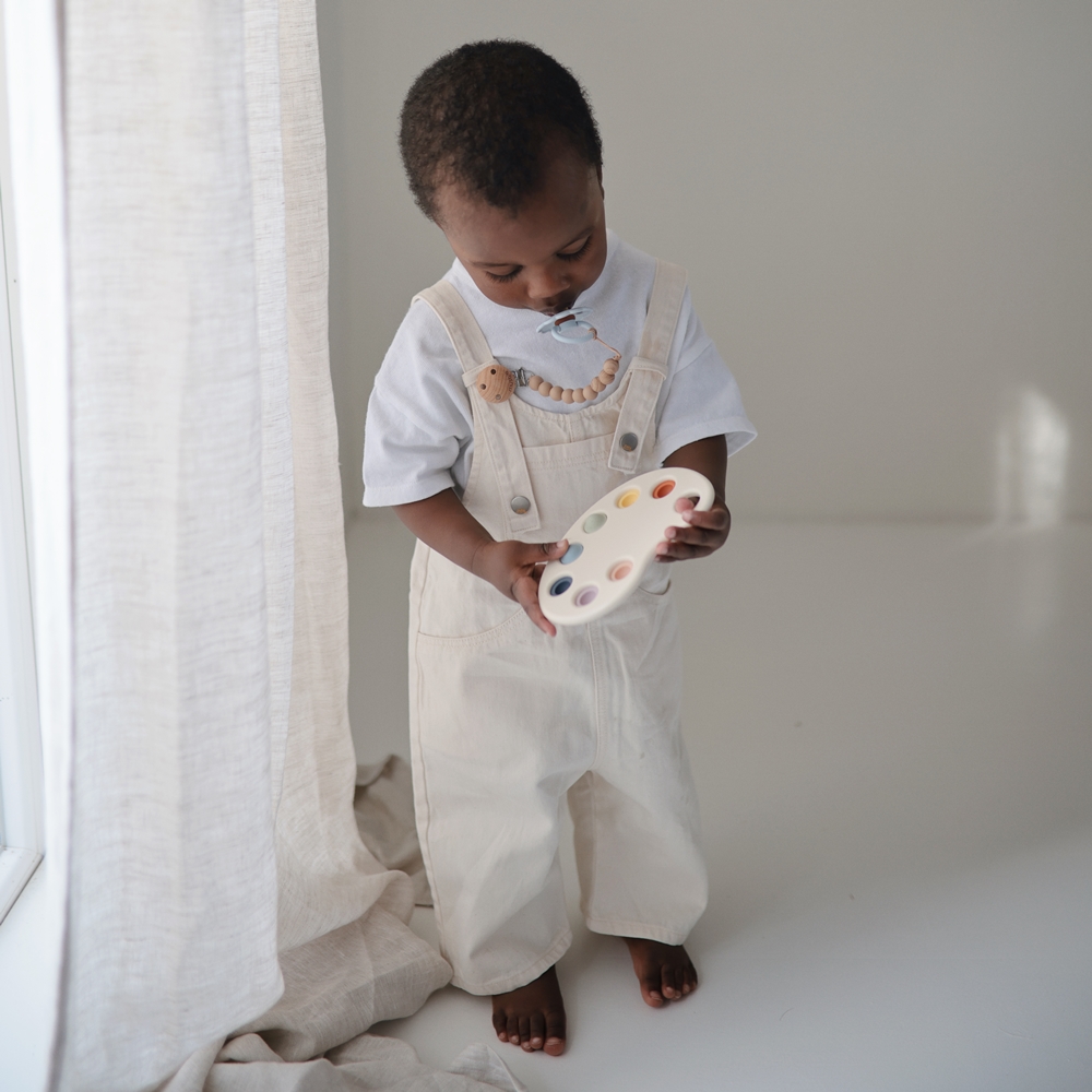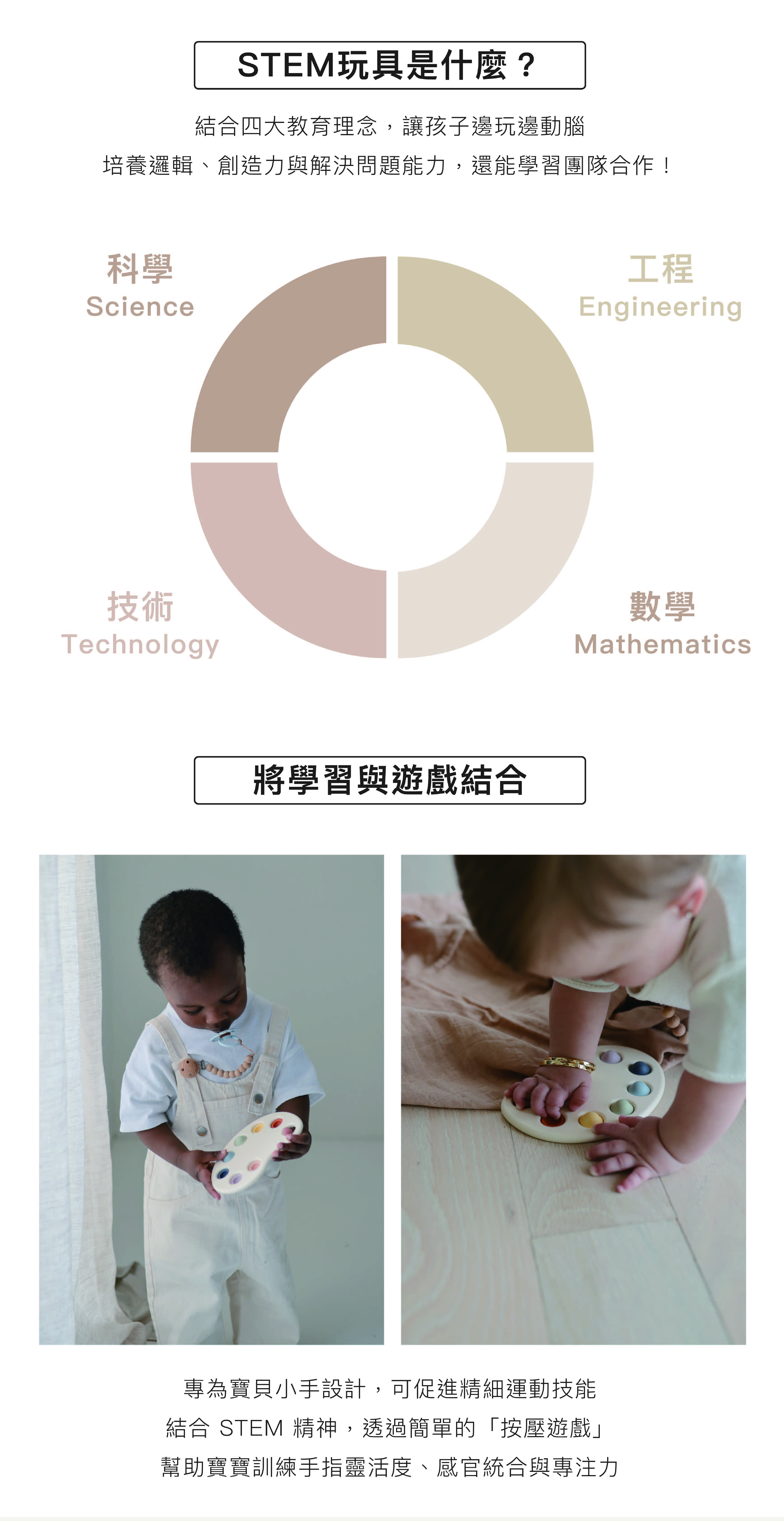 mushie的調色盤按壓玩具透過簡單的設計和柔和的色彩,鼓勵寶寶進行感官探索並發展精細動作技能。它採用食品級矽膠和無 BPA 塑膠框架,孩子們在按壓泡泡並聽到輕微的「啪」聲時,會進一步啟發學習,在觸覺、視覺與聽覺都能受到刺激。
