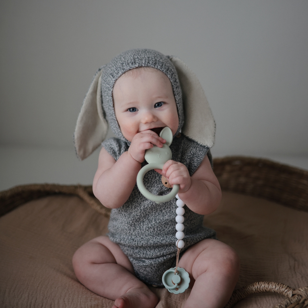 • 採用 100% 食品級矽膠製成,安全無毒,讓寶寶安心啃咬,爸媽也放心!• 設計俏皮又不失質感,不同紋理與立體造型,可以幫助寶寶緩解牙齦不適。• 剛剛好的大小設計,適合寶寶小手抓握、不容易掉,自己抓著咬也沒問題!