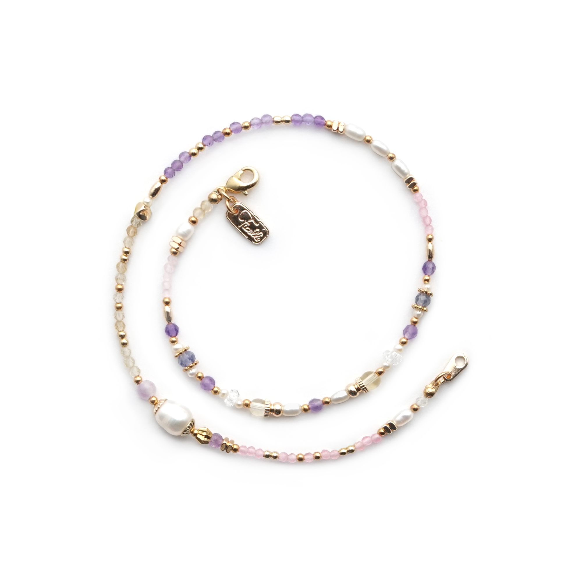 – 商品材質 Product Materials –淡水珍珠、紫水晶、粉貓眼石、黃水晶、堇青石、白水晶、黃銅鍍18K金