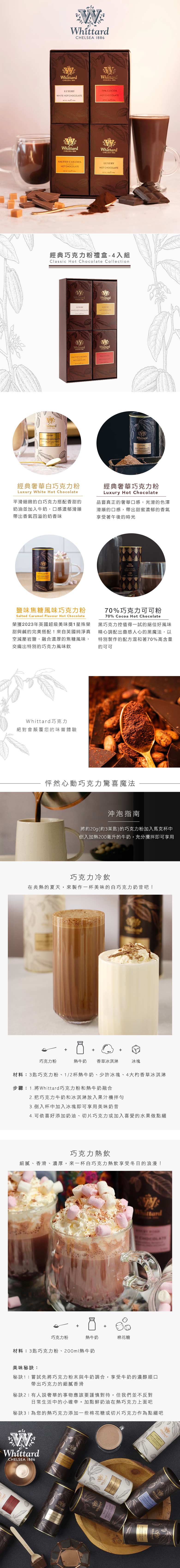 它不只是熱巧克力粉!同時也是為您送出四種風味,代表四種情緒,讓每一次沖泡都成為與幸福對話的儀式。我們精選最受歡迎的4款經典口味:香滑濃郁的奢華巧克力與奢華白巧克力,甜而不膩的鹽味焦糖巧克力,以及口感濃醇的70%巧克力可可粉。每一口,都是奢華與風味的完美演繹。只需加入熱牛奶即可享用,便能打造一杯療癒身心的濃醇飲品。