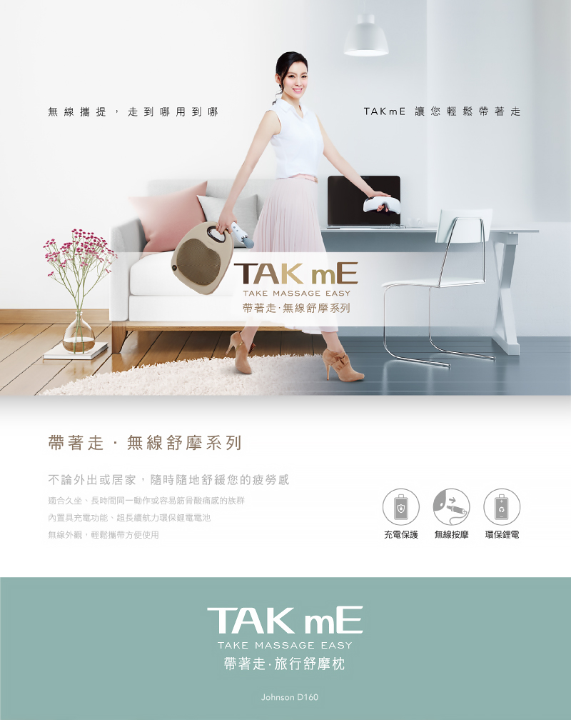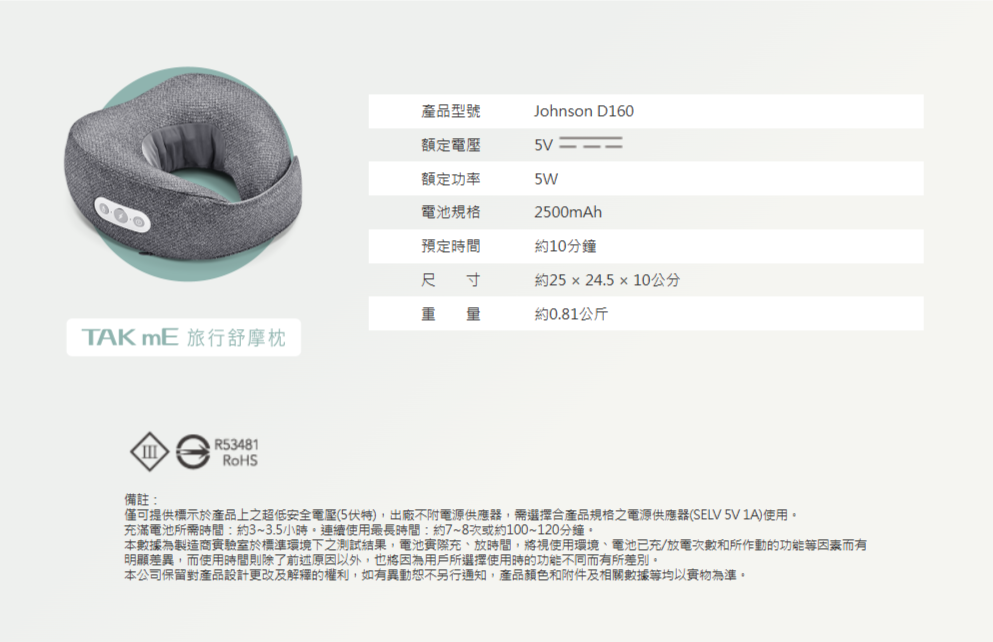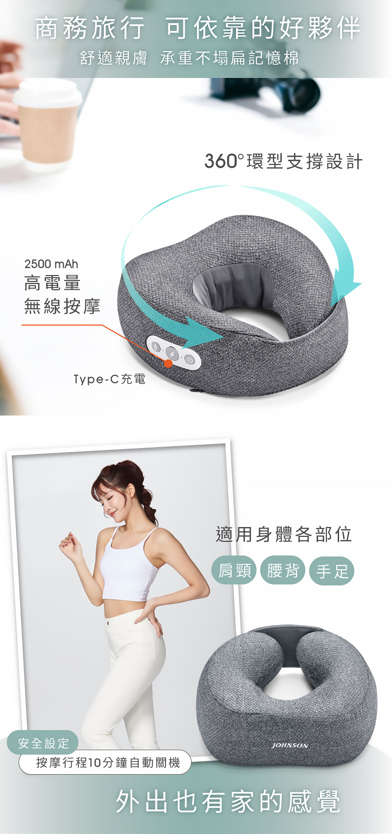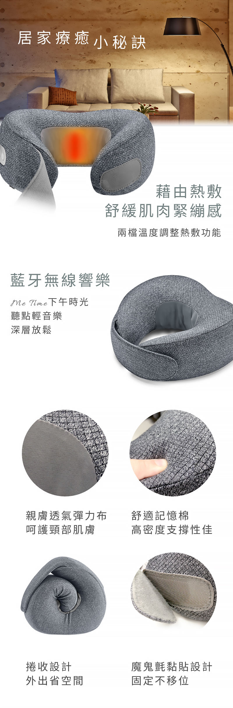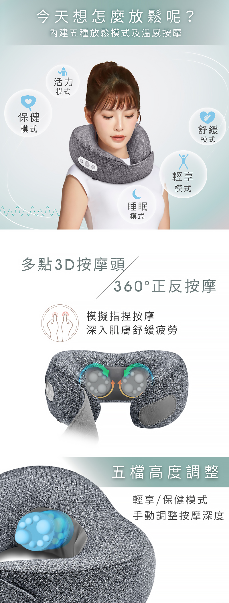 .內建五種舒緩模式及溫感按摩 輕享模式、保健模式、舒緩模式、活力模式、睡眠模式.五檔按摩高度,加強按摩深度 輕享模式及保健模式下,調整按摩高度.多指3D按摩頭,360°正反按摩 模擬指壓,深入揉捏舒緩疲勞.熱敷按摩,兩檔溫感熱敷調整.2500mAh高電量無線按摩 旅行、商務隨行攜帶,滿電後可使用約100~120分鐘.柔軟舒適記憶棉,高密度支撐性佳 360度環型支撐設計,按摩區使用親膚材質.藍牙功能,無線響樂.多部位使用,10分鐘自動關機 按摩頸、手、腰背、足腿等部位,按摩行程10分鐘自動關機