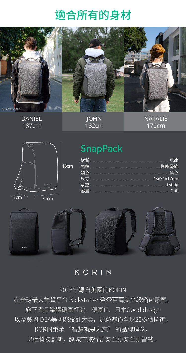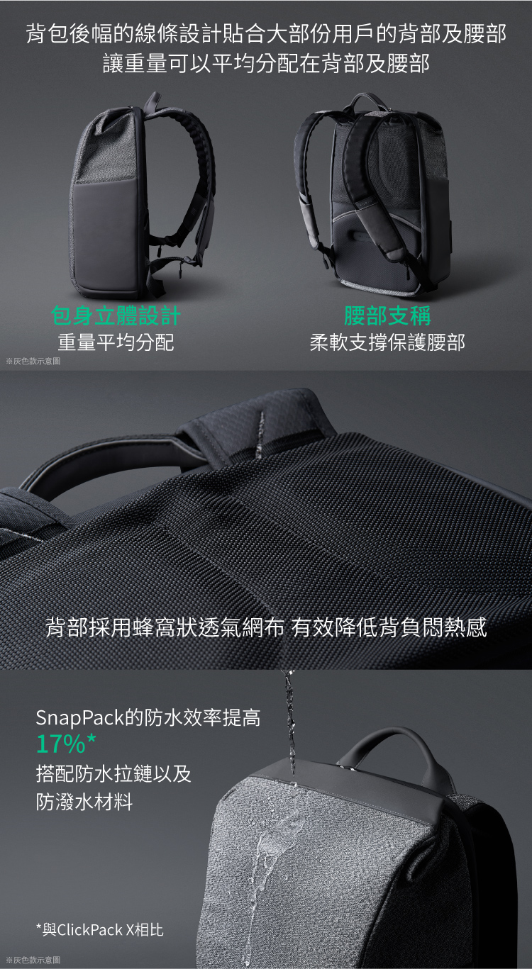 【產品規格】包裝內容物:SnapPack 防割防盜極速快取後背包-黑色特仕款*1材 質 :尼龍、聚酯纖維容 量 :20L重 量 :1500g(+/-10g)商品尺寸 :46 x 31 x 17 cm產 地 :中國大陸