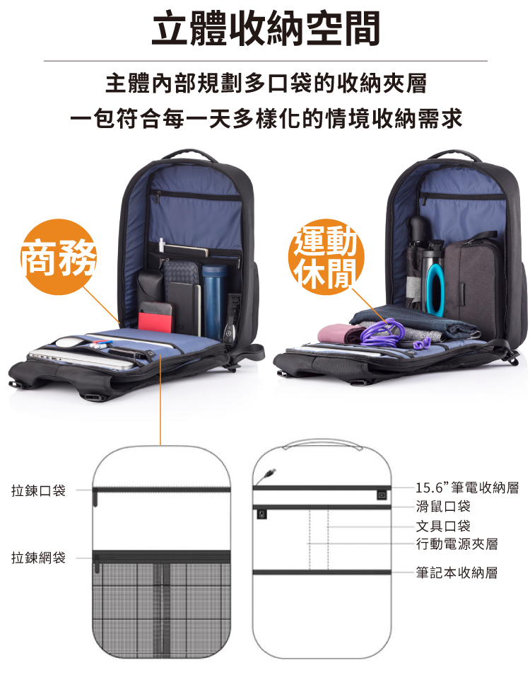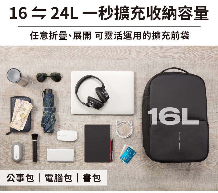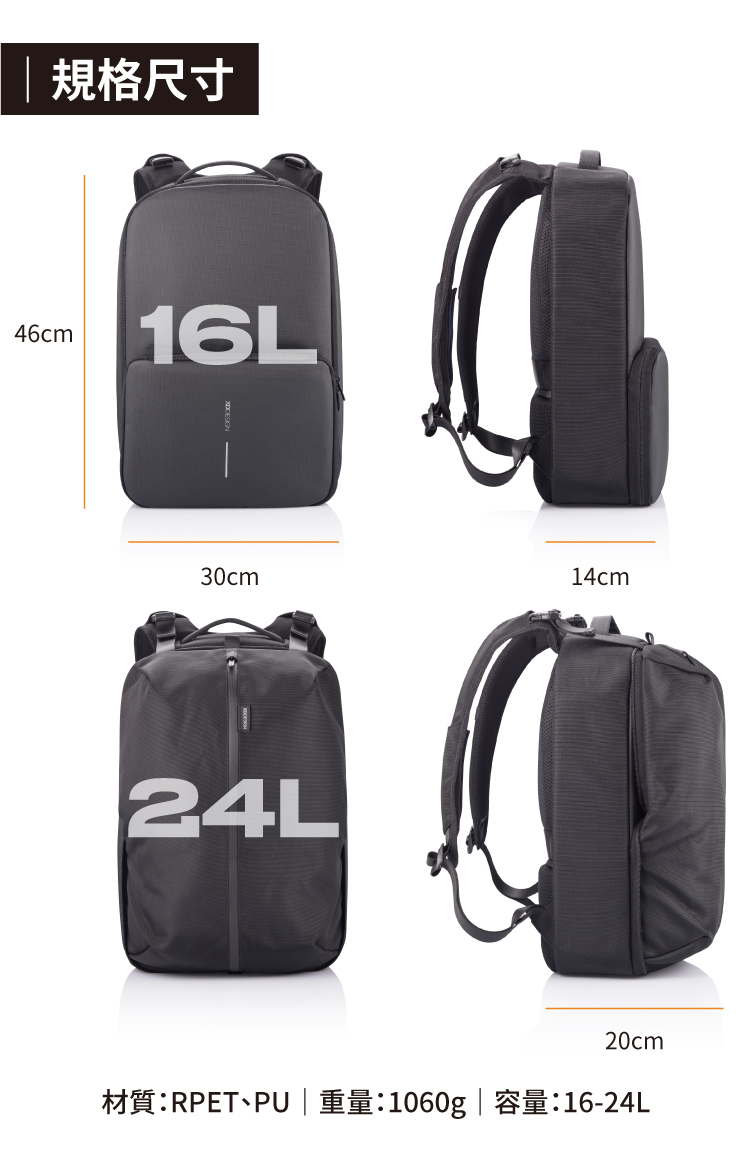 ◆ 商務通勤、休閒機能 靈活轉換◆ 16L→24L 一秒擴充收納容量◆ RFID防盜拷、USB外接充電標配◆ 可收納15.6吋筆電◆ 環保RPET材質製成