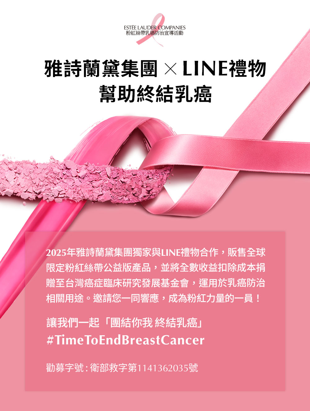 2025年雅詩蘭黛集團獨家與LINE禮物合作,販售全球限定2025年粉紅絲帶公益版產品,並將全數收益捐贈與台灣癌症臨床研究發展基金會,運用於乳癌防治相關用途。邀請您一同響應,成為粉紅力量的一員!