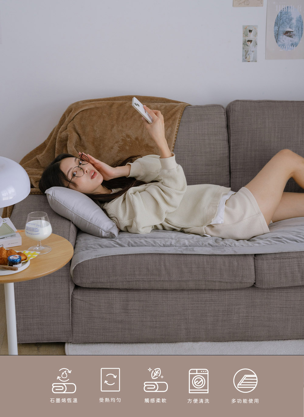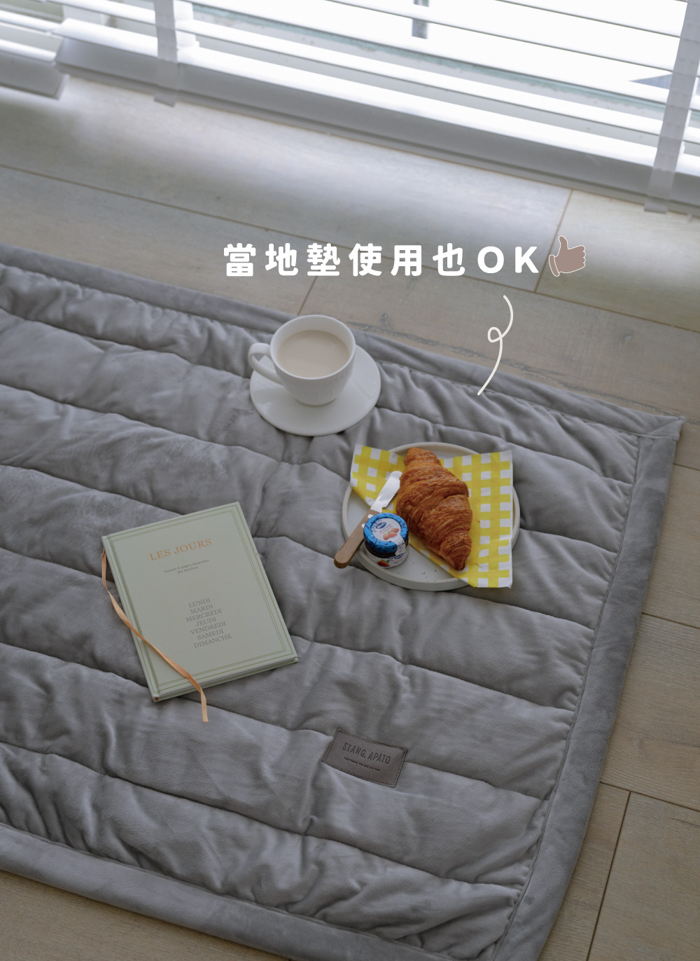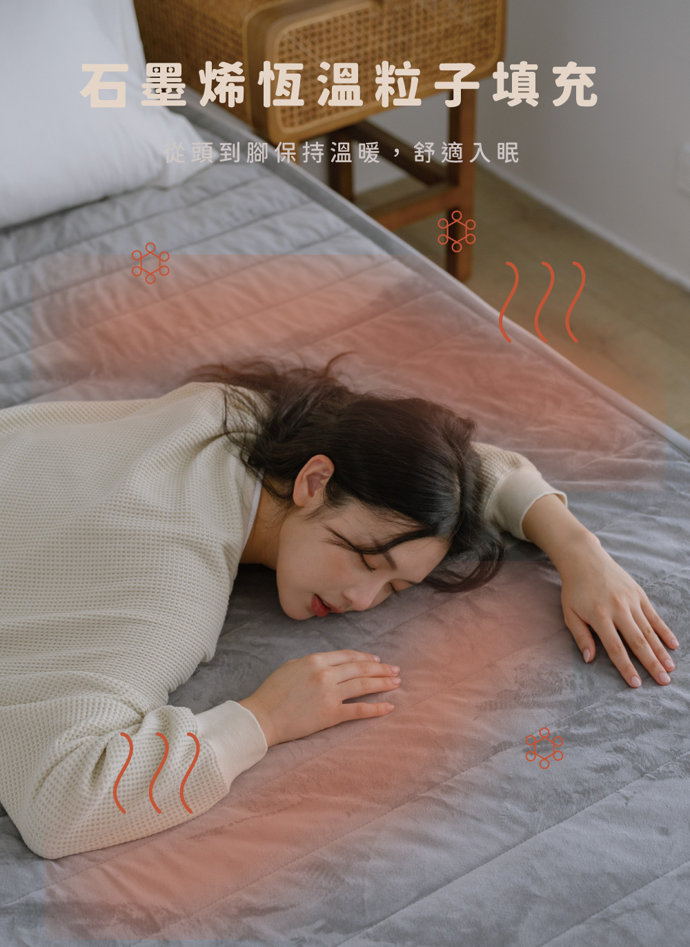 「不用電熱毯也能暖呼呼。」◆ 水晶絨材質表面,柔軟保暖◆ 填充添加石墨烯粒子,維持恆溫效果◆ 可當地墊、遊戲墊使用,功能多元