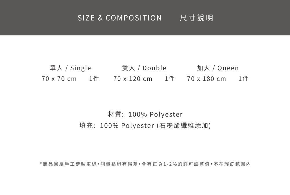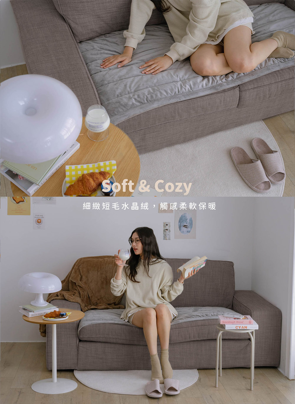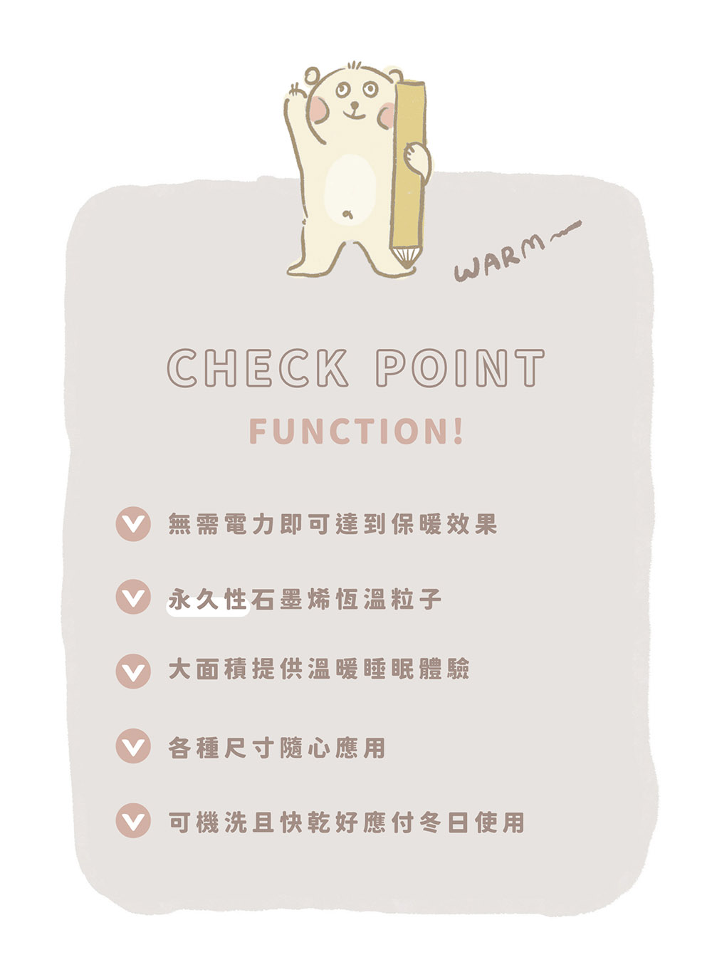 「不用電熱毯也能暖呼呼。」◆ 水晶絨材質表面,柔軟保暖◆ 填充添加石墨烯粒子,維持恆溫效果◆ 可當地墊、遊戲墊使用,功能多元