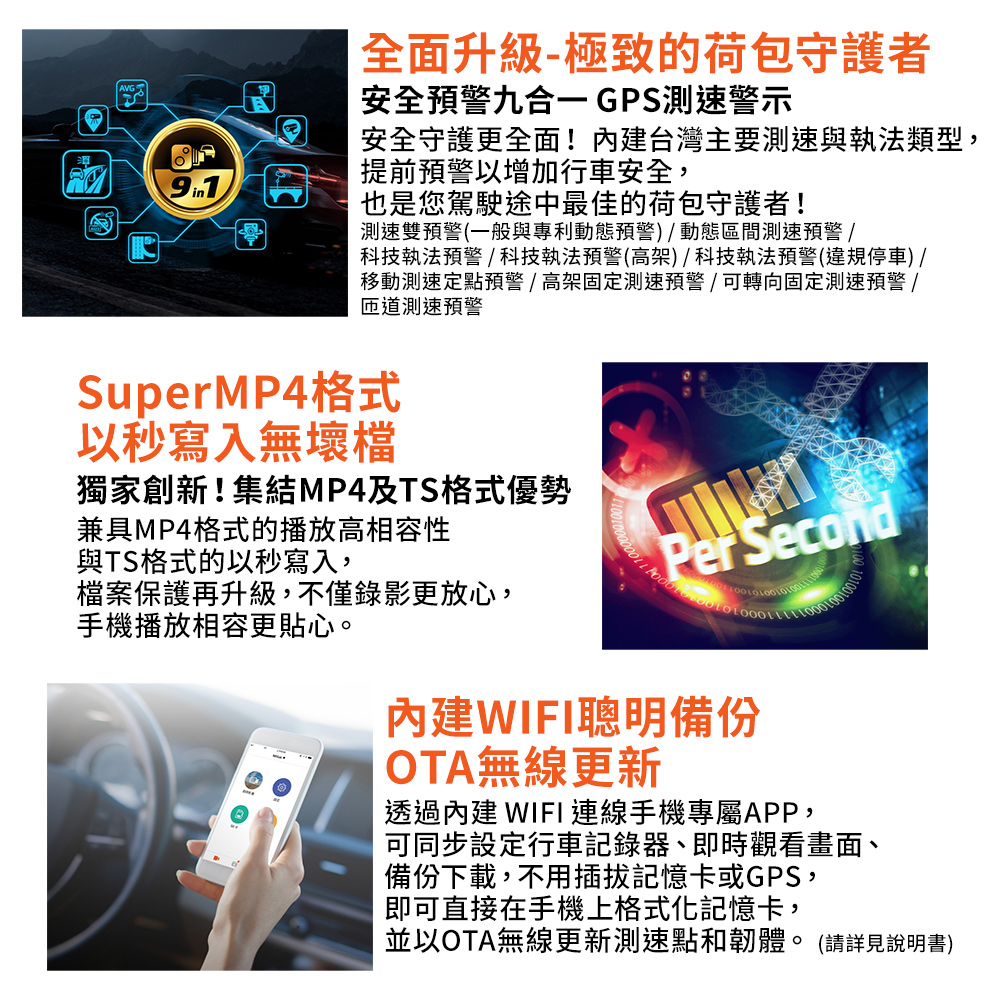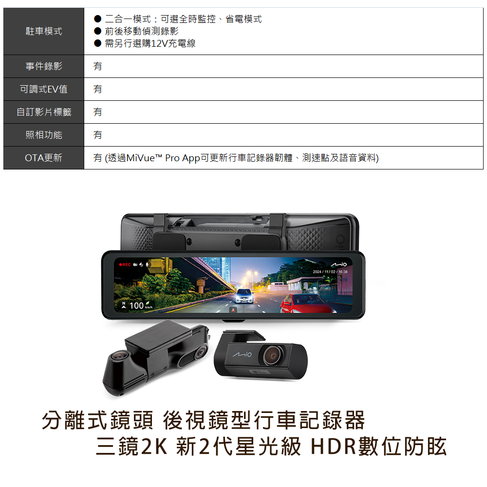 ★前2K後2K側/內2K 三鏡頭高解析同步錄影★獨家!1500 nits 高亮度螢幕背光模組★高亮度低反光無疊影 螢幕清晰同級之最★鏡頭與主機分離式設計 視野零遮角★採用 Sony 的新2代星光級感光元件★安全預警九合一 GPS 測速警示★內建二合一駐車模式