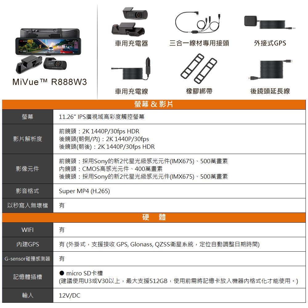 商品規格:品名:Mio MiVue R888W3 3鏡頭後視鏡型行車記錄器BSMI字號:R45630 NCC字號:CCAM24LP1390T3主機尺寸:73.8 x 281 x 24 mm前鏡頭尺寸:25.7 x 69.85 x 28.9 mm後鏡頭尺寸:34.4 x 117.8 x 40.4mm主機重量:390g前鏡頭重量:43.6 g後鏡頭重量:85 g保固範圍:新品暇疵保固期限:原廠保固3年產地:中國