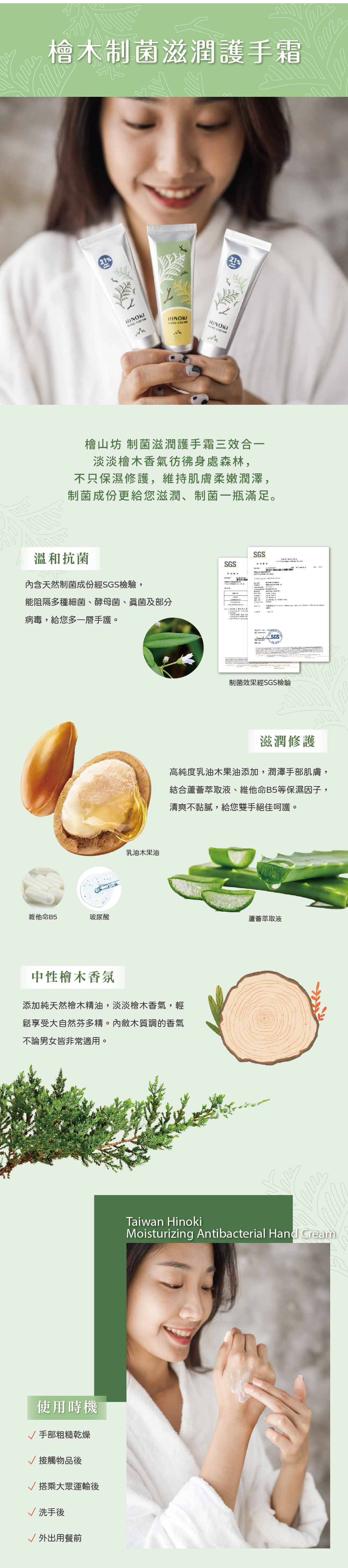 添加純天然檜木精油,濃郁檜木香氣,輕鬆享受大自然芬多精!高純度乳油木果油添加,潤澤修護手部,結合蘆薈萃取液、維他命B5等保濕因子,給您雙手絕佳呵護。