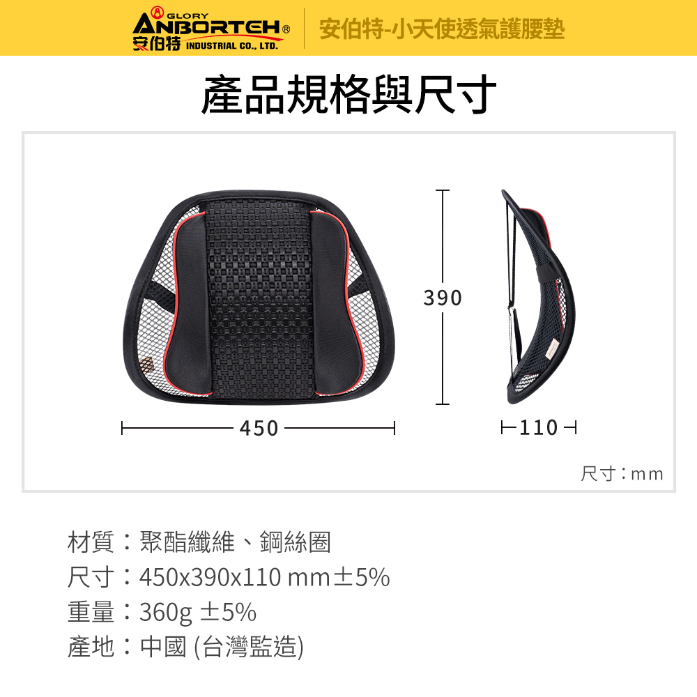 商品規格品名:【安伯特】小天使透氣護腰墊型號:ABT-A238材質:聚酯纖維、鋼絲圈尺寸:450x390x110 mm ±5%重量:360g ±5%保固範圍:新品暇疵產地:中國(台灣監造)