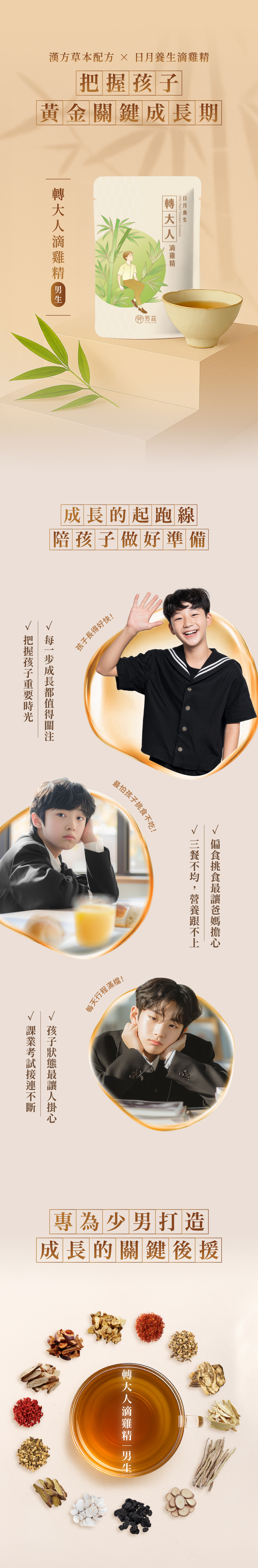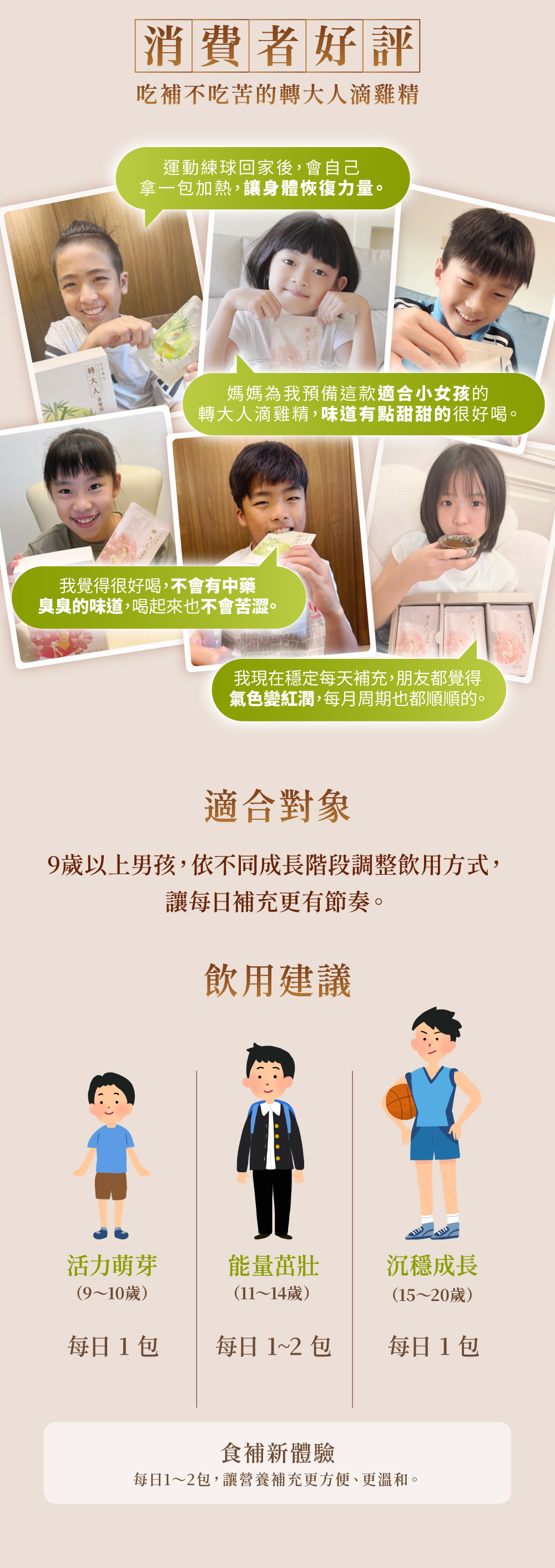 .漢方草本14味x嚴選紅羽土雞100%全雞新鮮滴煉,守護黃金成長期.權威中醫師及營養師雙重把關,專為 9–20 歲男孩日常調養設計.以榮獲健字號『小綠人』抗疲勞認證的【日月養生滴雞精】為基底,為成長期打好基礎.0 脂肪、0 膽固醇、低鈉設計,日常飲用更安心.常溫保存,即開即飲,學習、運動或休息,皆能輕鬆補充