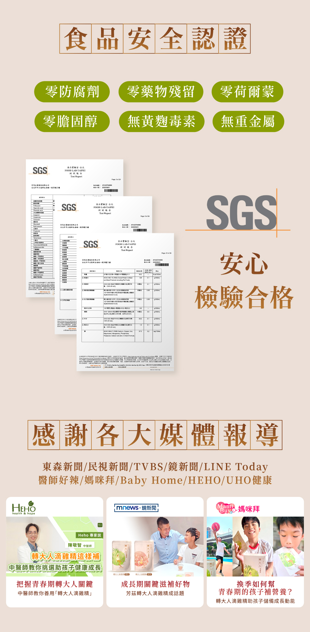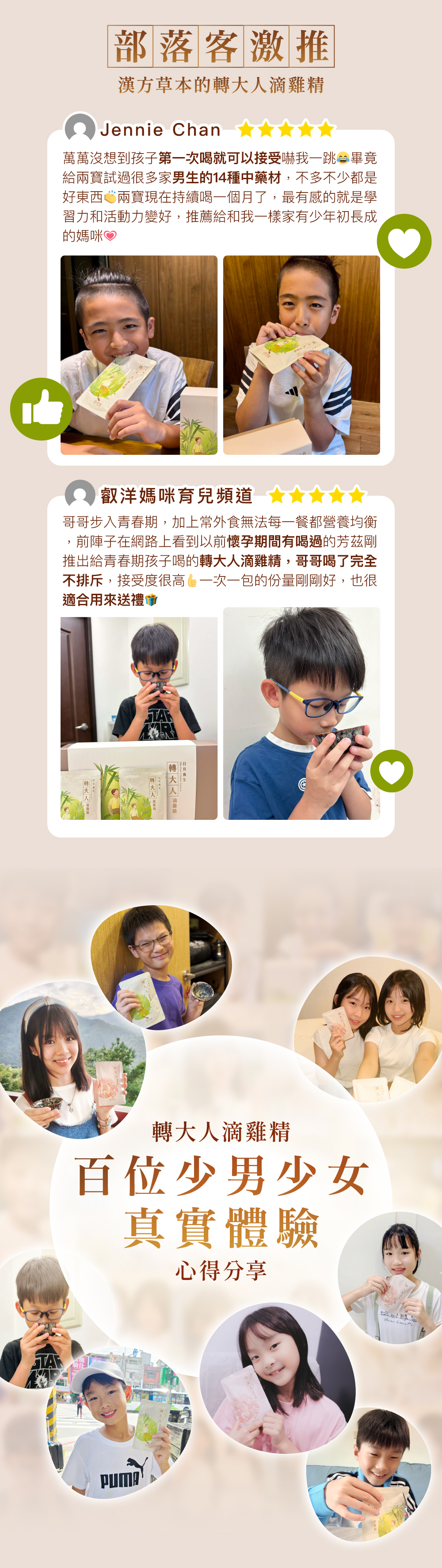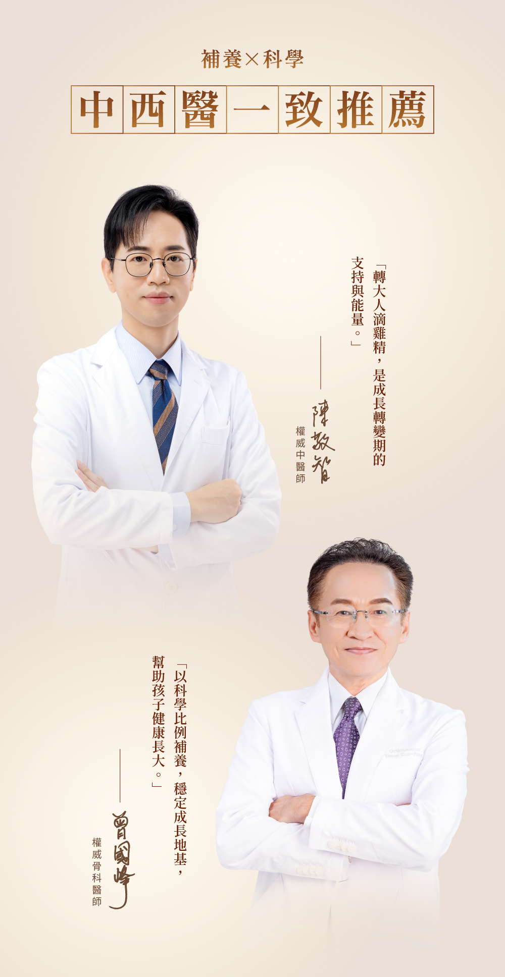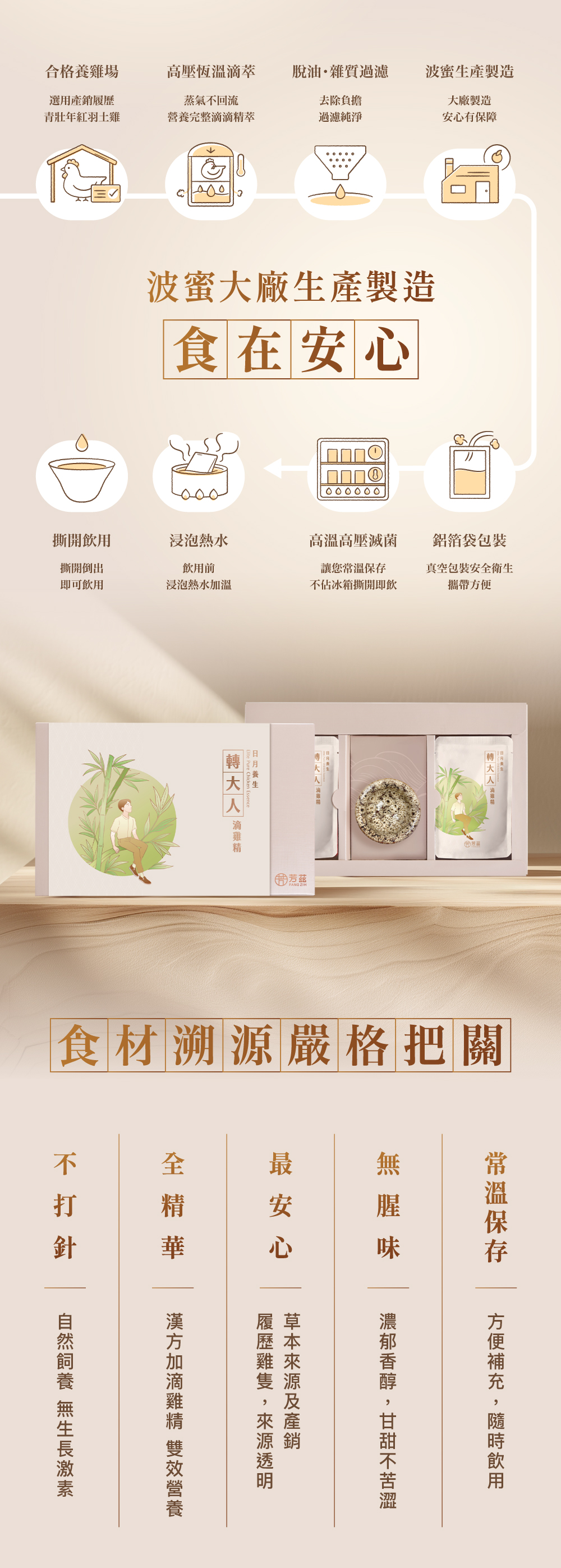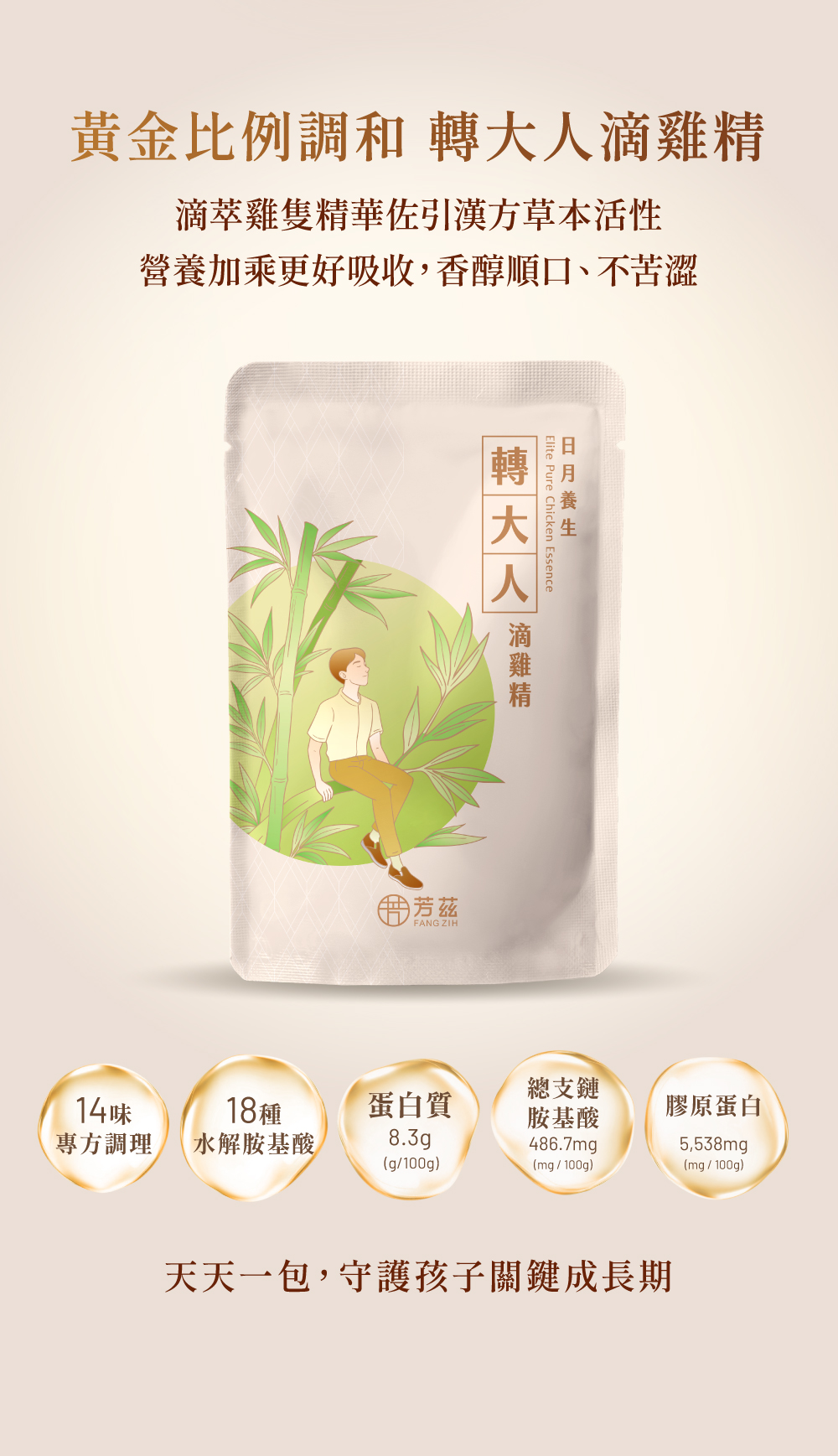 .漢方草本14味x嚴選紅羽土雞100%全雞新鮮滴煉,守護黃金成長期.權威中醫師及營養師雙重把關,專為 9–20 歲男孩日常調養設計.以榮獲健字號『小綠人』抗疲勞認證的【日月養生滴雞精】為基底,為成長期打好基礎.0 脂肪、0 膽固醇、低鈉設計,日常飲用更安心.常溫保存,即開即飲,學習、運動或休息,皆能輕鬆補充